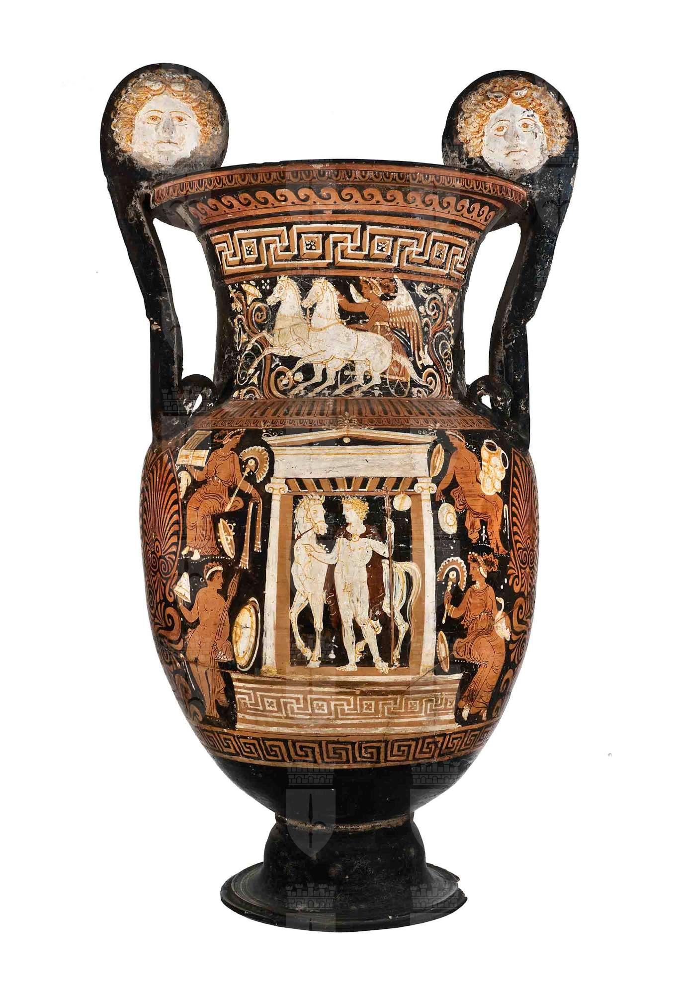 Cratere a volute con mascheroni con anse terminanti a teste di cigno; apulo a figure rosse. Lato A: defunto eroicizzato: su un basamento modanato, in un'edicola frontale, sta un giovane guerriero stante e tiene alla briglia un cavallo; ai lati quattro offerenti seduti rivolti al centro. Lato B: al centro un'edicola contenente due fiori campanulati sovrapposti e palmetta; ai lati quattro offerenti seduti.
