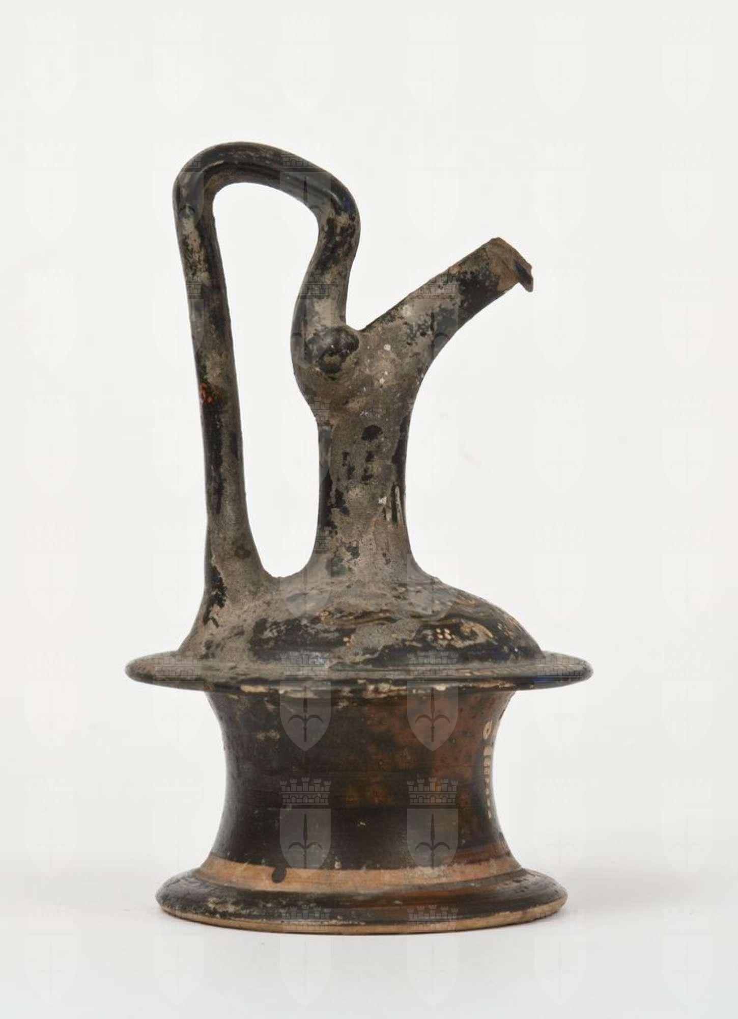 Epichysis a rocchetto a vernice nera con sovraddipinture in giallo oro e bianco. Lungo beccuccio con labbro distinto modanato, stretto collo cilindrico con piccola modanatura alla base, corpo cilindrico a profilo concavo, ansa a nastro sormontante, piede a disco. Sul collo: sequenza di bastoncelli e fila di punti (alla base del collo, sotto la piccola modanatura) dipinti in bianco (o giallo su base bianca, se si ipotizza che il giallo sia saltato). Sulla spalla: tralcio di edera di tipo New Ivy, con stelo sinuoso dipinto e rosette di punti in giallo oro; sulla flangia meandro merlato dipinto in giallo oro. Sul corpo cilindrico: grappolo centrale in bianco-giallo tra due coppie di cerchi disposti su una serie di linee orizzontali digradanti.