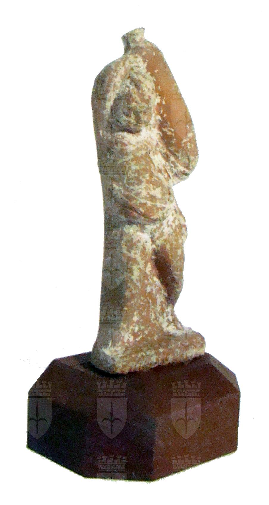 Figura fittile, realizzata a matrice. Cava. Sul retro cavità circolare. Sul retro reca la scritta in matita "100, 7" e quella in rosso "642, 5088". Sul fianco della basetta lignea moderna è applicata un'etichetta con il numero "642". Figurina infantile, nuda che sorregge sulle spalle un'anfora oblunga.