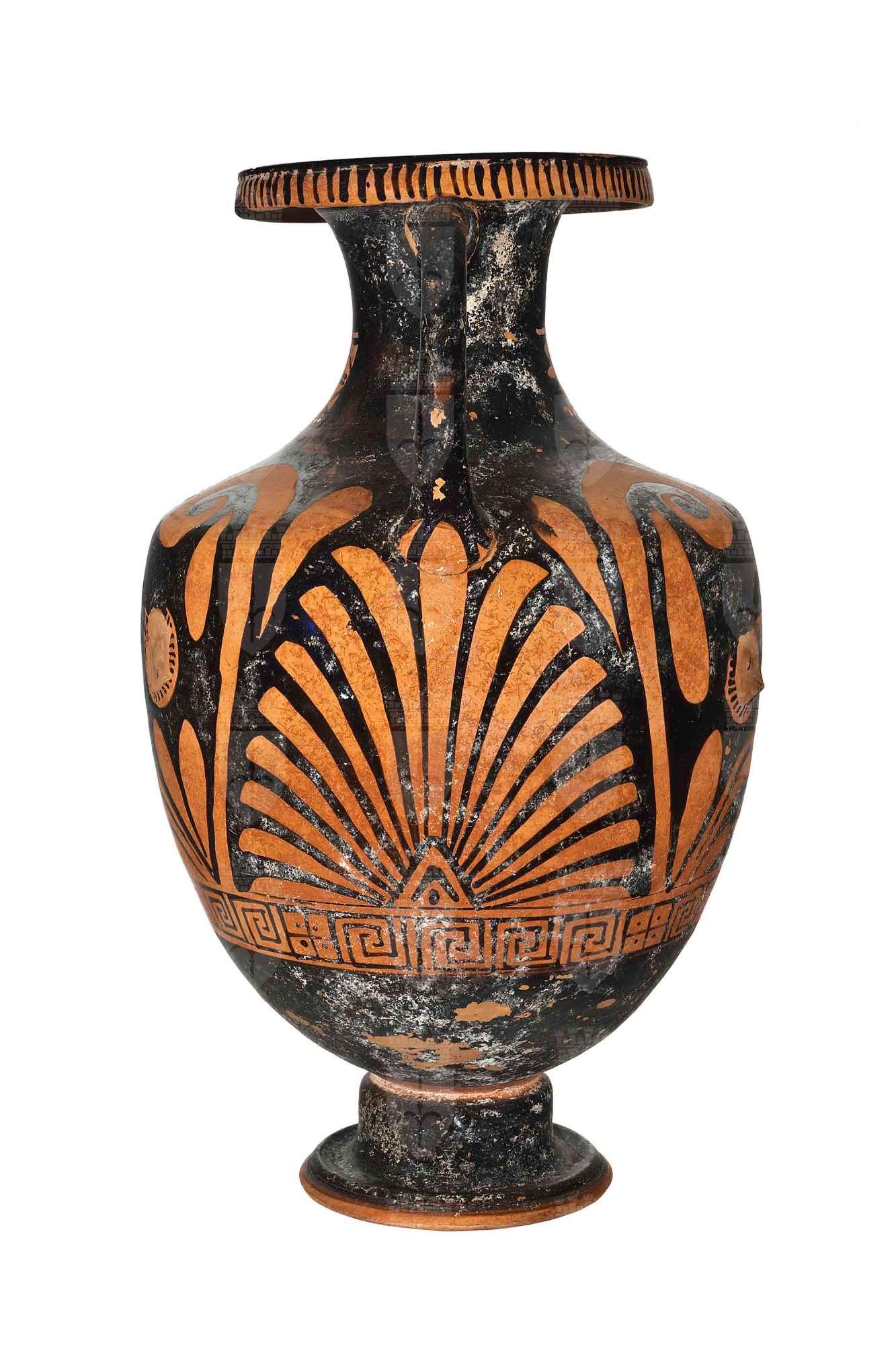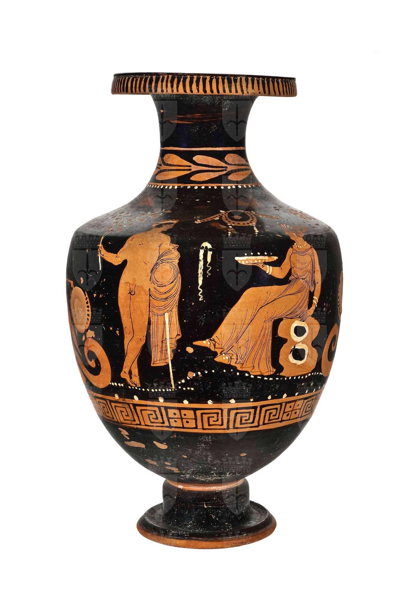 Hydria apula a figure rosse le cui due anse si sono staccate lasciando le cicatrici nel punto di adesione. Donna seduta con patera con offerte e giovane nudo con serto; elementi vegetali sotto l'ansa.