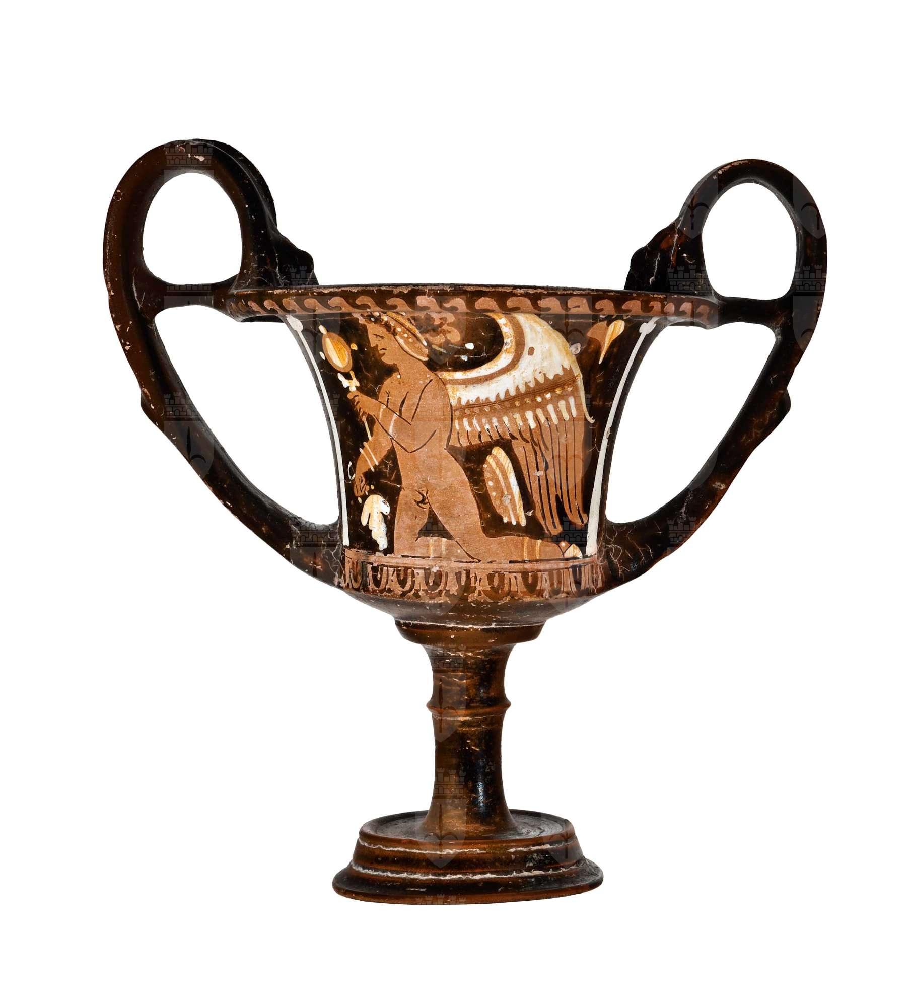Kantharos apulo a figure rosse con elementi bianchi. Lato A: Eros nudo alato inginocchiato con kalathos, grappolo patera e specchio. Lato B: Eros simile con grappolo e specchio.