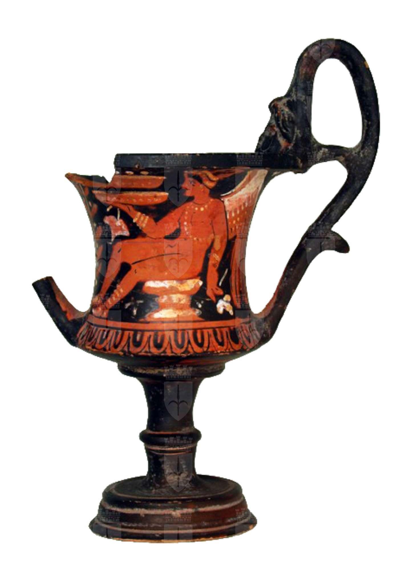 Orlo svasato con labbro estroflesso; bicchiere a profilo concavo con protomi antropomorfe all’attacco delle anse superiori e con linguette in prossimità dell’attacco inferiore. Lato A: figura femminile seduta con specchio, cista e benda Figura femminile di tre quarti verso destra, retrospiciente e seduta su roccia a più piani sovradipinti in bianco; regge nella destra sollevata uno specchio con dettagli sovradipinti in giallo; nella s. tiene una cista con croce di Sant’Andrea a vernice nera e una benda con dettagli in giallo alle estremità (in parte evanidi); indossa un lungo chitone allacciato sulle spalle e stretto in vita con una cintura in bianco sovradipinto con fiocco; capelli raccolti in una mitra decorata con linee in bianco sovradipinto. In bianco sovradipinto anche gli orecchini, l’armilla al polso, la collana ad unico filo di vaghi circolari pendenti e decorazioni sulle embades ai piedi. Sulla linea di terra, a sinistra., coppia di fiori a campanula profilati in bianco e alternata a puntini sovradipinti. Nel campo, in basso, crocetta in bianco sovradipinto; in alto a d. benda appesa in giallo sovradipinto. Lato B: erote seduto con coppia di patera e foglie d’edera Erote di tre quarti verso sinistra con testa di profilo, seduto su roccia a più strati campiti in bianco. Regge nella destra due phialai sovrapposte profilate e decorate con fila di punti in giallo sovrapposto; sempre nella d. foglia d’edera profilata in bianco. La s. appoggiata indietro stringe una foglia in bianco sovradipinto. L’erote, nudo, è caratterizzato da numerosi dettagli sovradipinti: porta i capelli raccolti in una mitra puntinata in giallo; le ali campite in bianco nella parte superiore e con i particolari del piumaggio a vernice nera nella parte inferiore. Orecchini a due grani pendenti, armilla al pols, collana a due file di vaghi circolari – uno girocollo, l'altro a tracolla e ricadente sul petto –, decorazione sulla coscia (ormai evanida), cavigliera rigida a più cerchi e decorazioni sulle embades ai piedi, tutti in giallo sovradipinto. Sulla linea di terra, a sinistra arbusto con coppie di foglie lanceolate alternate a coppie di puntini in giallo sovradipinto. Nel campo, al di sotto delle gambe, crocetta in bianco sovradipinto (in parte evanido).