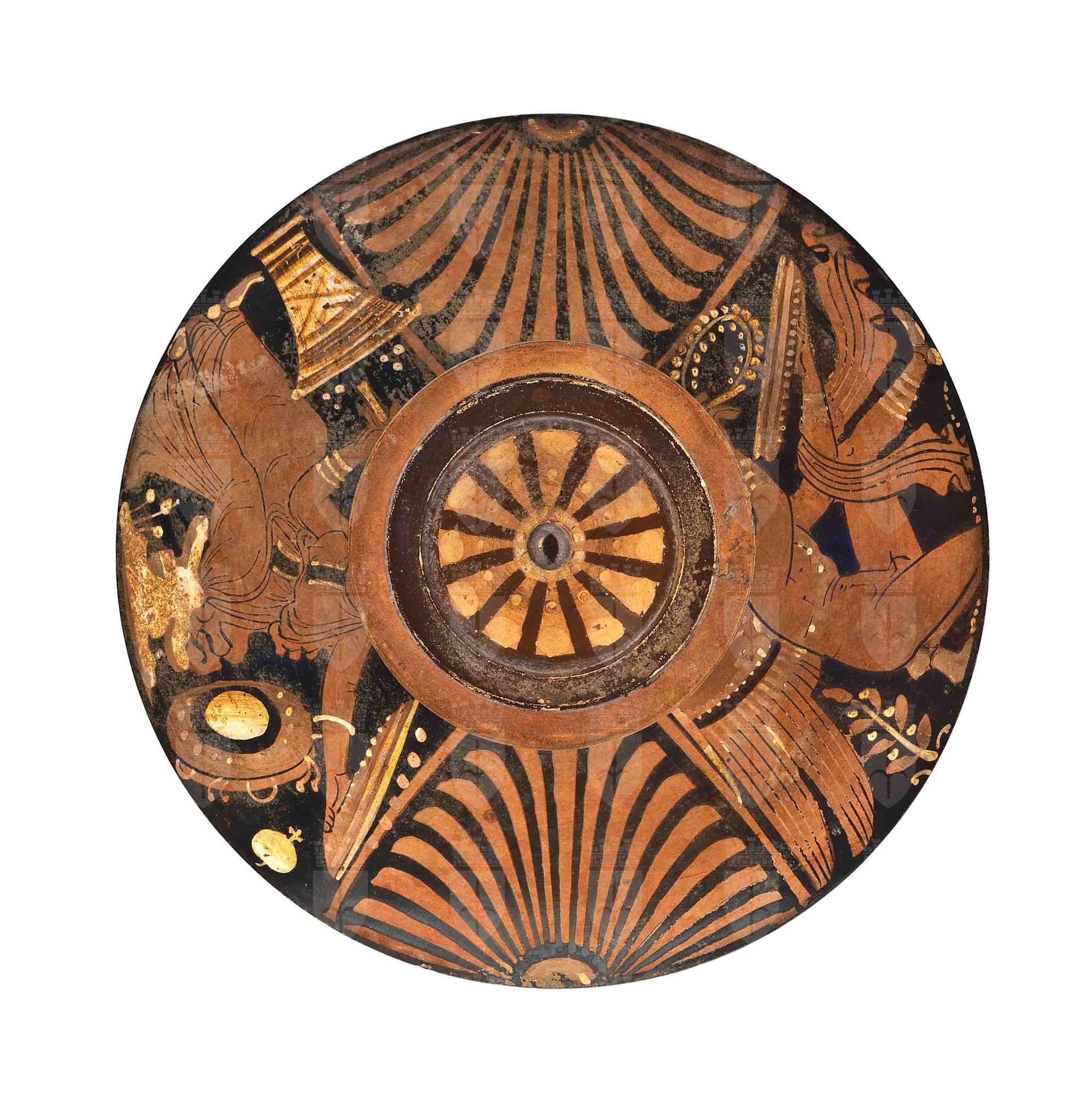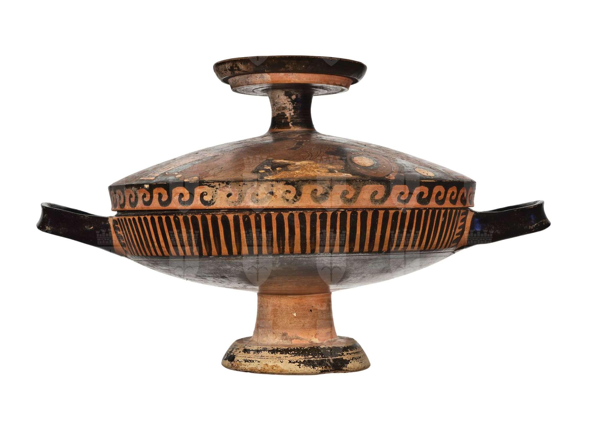 Coppa e coperchio di lekanis apula a figure rosse. Coppa su stelo rosso e decorazione a linee verticali tra le anse; Coperchio. Lato A: Eros nudo con patera, ghirlanda, specchio, capigliatura femminile e orecchini. Lato B: donna vestita di chitone con patera, ventaglio e kalathos a terra.