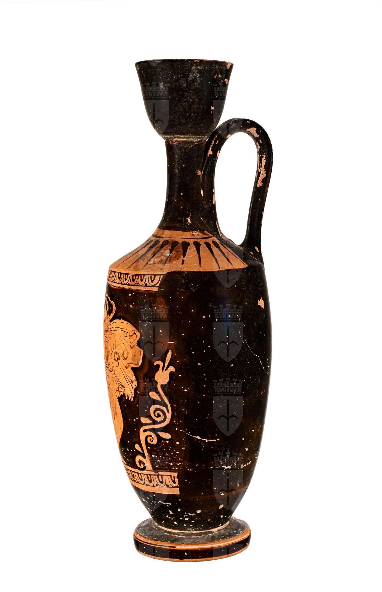 Lekythos attica a figure rosse con immagine di donna con chitone e himation svolazzante, seno in rilievo, in fuga verso destra, volge il capo all'indietro.