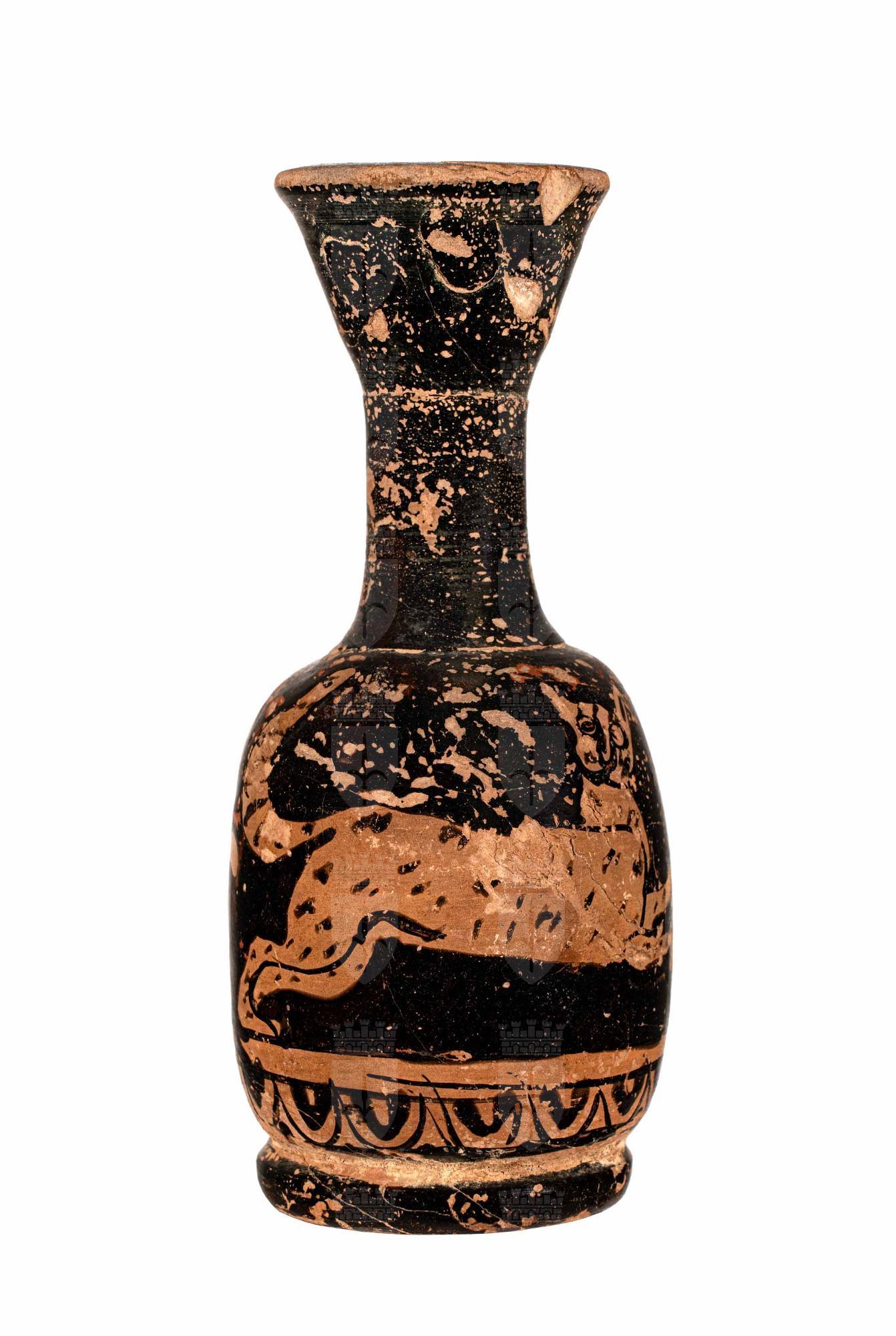 Lekythos attica a figure rosse, palmetta sotto l'ansa e felino in corsa.