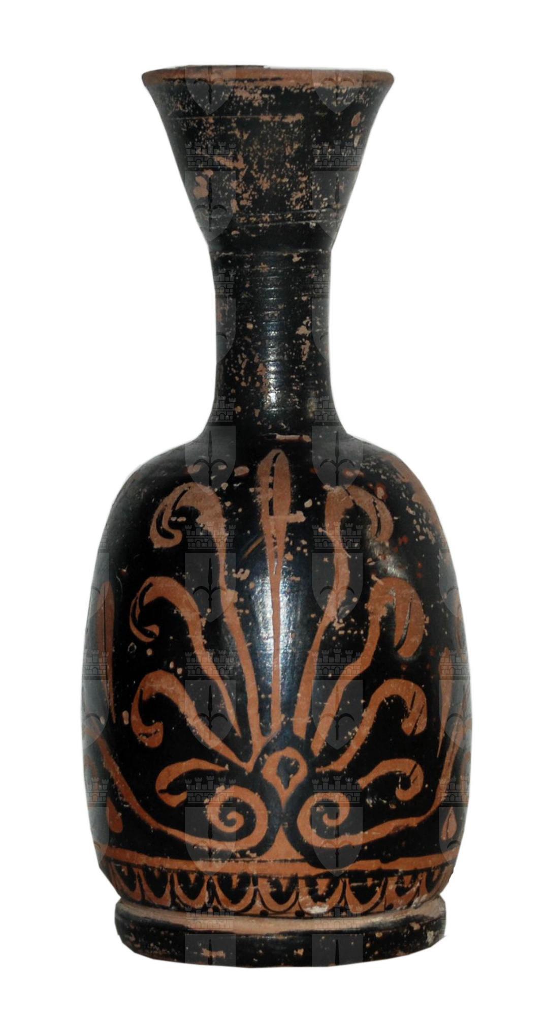 Lekythos aryballico a figure rosse con largo bocchello distinto, svasato, con labbro leggermente estroflesso. Collo dal profilo leggermente concavo. Lato A: palmetta tra girali con coppia di colombe. Palmetta costituita da 8 foglie con linea nera mediana e con parte terminale falcata; centralmente, foglia arrotondata all’estremità. Al centro calice romboidale con contorno a risparmio e campito centralmente in nero su coppia di foglie spiraliformi ai lati di un triangolo a risparmio. La palmetta è contornata lateralmente da due elementi vegetali con coppia di foglie spiraliformi con linea mediana nera con infiorescenza centrale a più petali e foglie ovate. Al di sopra di ciascun ramoscello, colomba in volo di profilo verso il centro rimangono evidenti i tratti a vernice nera del piumaggio su ali e coda; zampe abbassate, come per atterrare e appoggiarsi alla foglia sottostante.