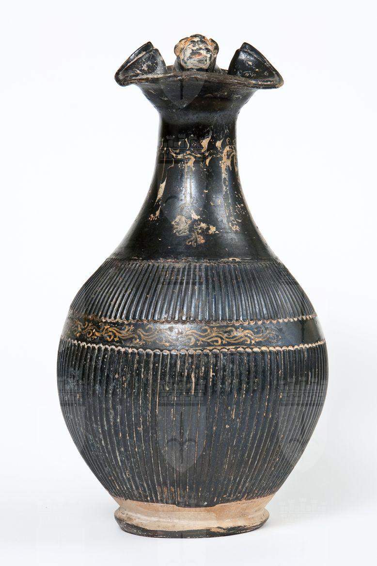 Oinochoe a vernice nera a tratti più chiara con sovraddipinture in bianco, giallo e rosso. labbro modanato, orlo estroflesso e trilobato, collo a profilo concavo, corpo globulare baccellato, con fascia liscia tra le baccellature, ansa a nastro verticale terminante in due protomi virili: una all’attacco superiore, che sembra raffigurare propriamente una maschera teatrale; una all’attacco inferiore, sembrerebbe un volto femminile, basso piede ad anello. Sul collo: tralcio d’edera con stelo sinuoso e rosette di punti in giallo, da cui pendono due bende frangiate disposte ad incorniciare una maschera centrale dal volto femminile, rivolto a sinistra. Dal tralcio di edera vanno, poi, a distaccarsi, alle estremità laterali, due rami secchi con foglie a trattini dipinti in giallo. Una linea dipinta in giallo va ad inquadrare superiormente il corpo baccellato. La fascia liscia tra le baccellature, evidenziata da due linee dipinte in giallo, è decorata da girali con fiori campanulati.