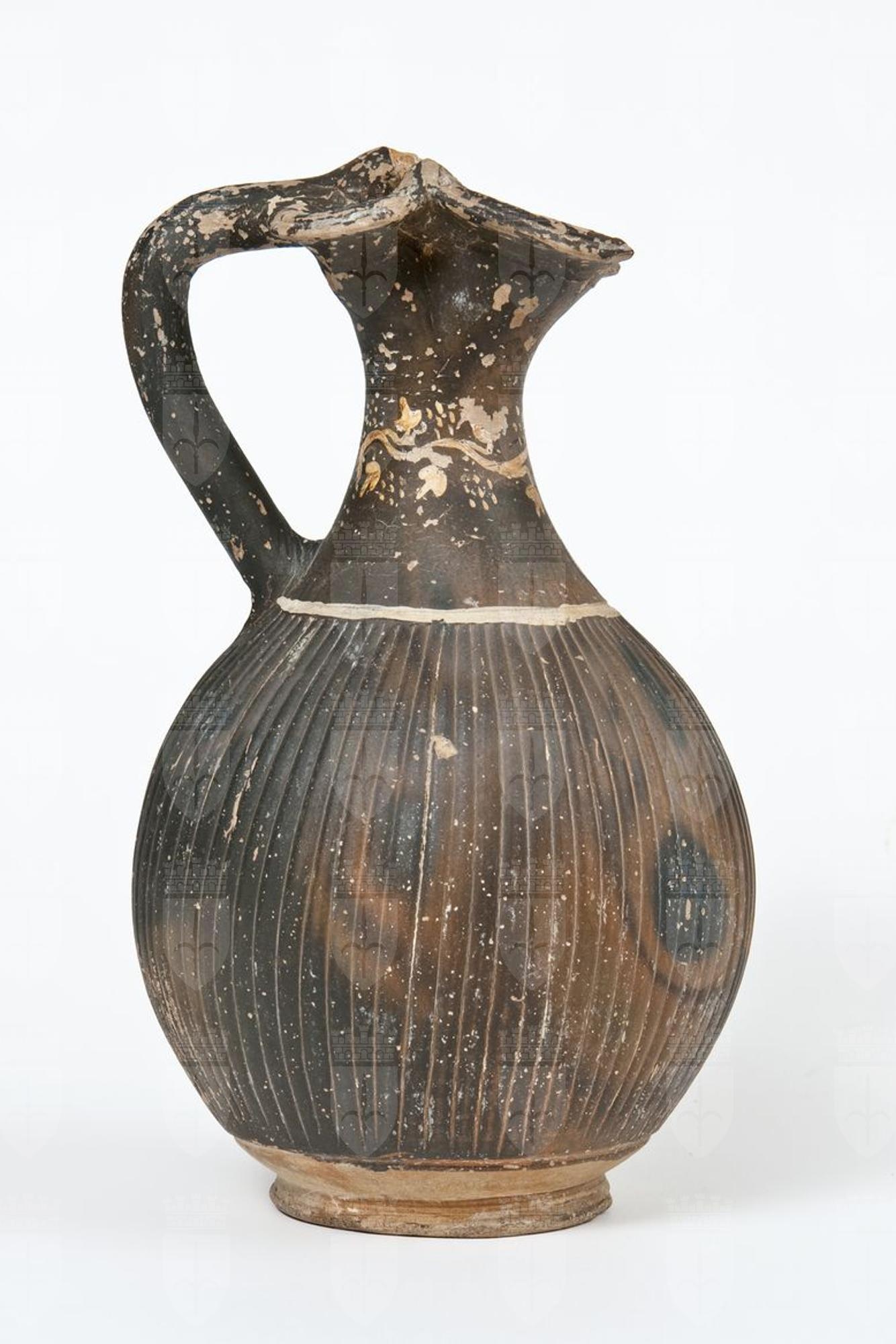 Oinochoe a vernice nera, tendente al bruno, con sovraddipinture in bianco e giallo. Labbro modanato, orlo estroflesso e trilobato, stretto collo a profilo concavo, corpo globulare strigilato espanso, ansa a bastoncello leggermente obliqua, desinente alla sommità, nel punto d’attacco all’orlo, in una protome ferina, piede ad anello. Sul collo: tralcio di edera con stelo ondulato dipinto e rosette di punti; alla base del collo, linea incisa e campita in bianco crema.