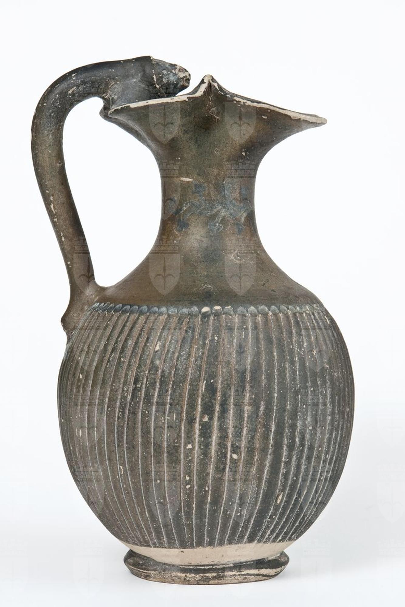 Oinochoe a vernice nera opaca, tendente al bruno e in alcuni punti all’olivastro, con sovraddipinture in bianco. Labbro espanso e leggermente modanato, orlo trilobato, basso collo a profilo concavo, corpo globulare baccellato, ansa a bastoncello verticale desinente alla sommità, nel punto d’attacco all’orlo, in una protome leonina, piede ad anello. Sul collo si intravedono le tracce di quello che doveva essere un tralcio di edera a stelo sinuoso, inoltre una linea dipinta in bianco andava ad inquadrare superiormente il corpo baccellato.
