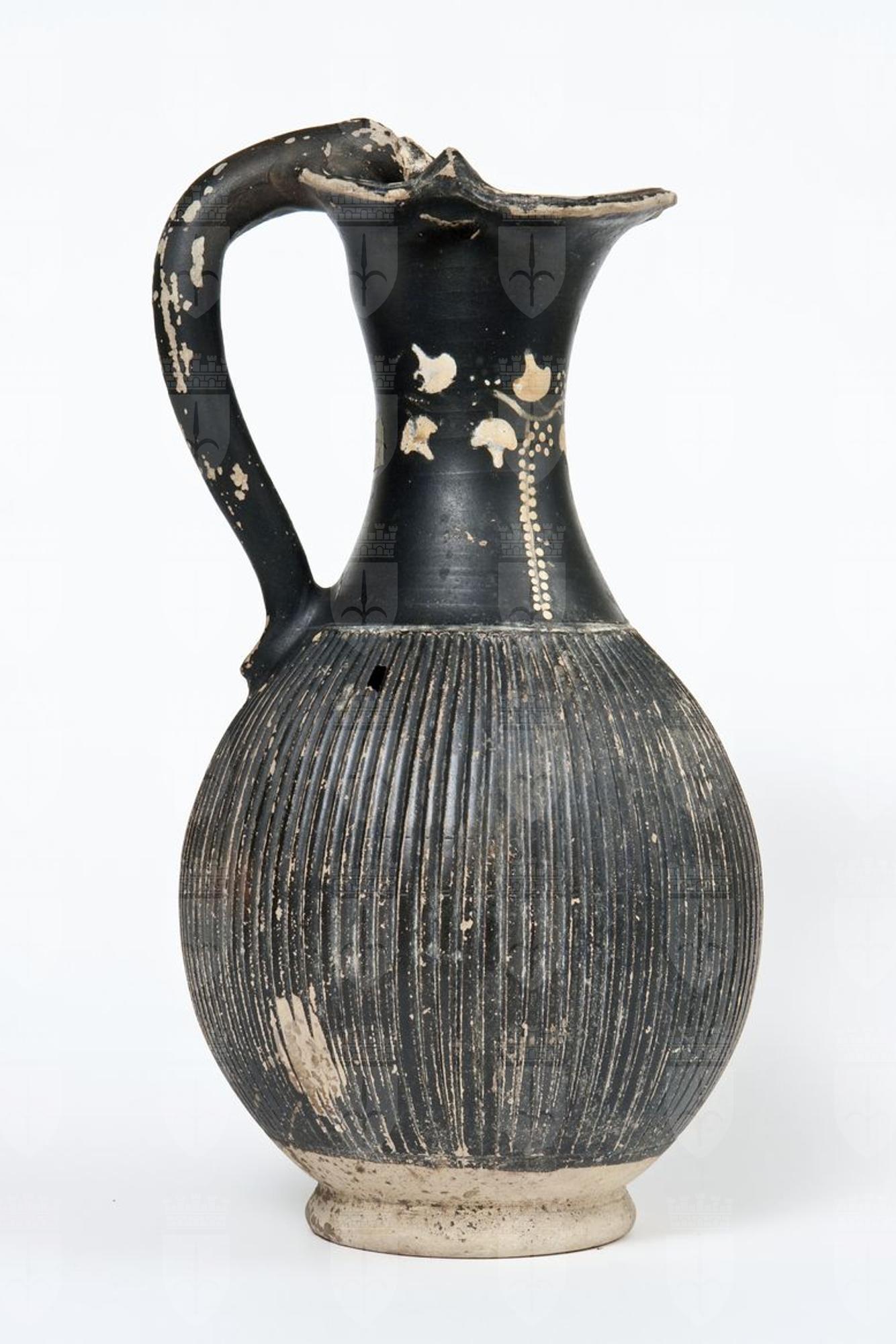 Oinochoe a vernice nera con sovraddipinture in bianco e giallo. Labbro modanato, orlo estroflesso e trilobato, collo a profilo concavo, corpo globulare strigilato, ansa a bastoncello verticale desinente alla sommità, nel punto d’attacco all’orlo, in una protome ferina/leonina, piede ad anello. Sul collo: tralcio di edera a pergolato con stelo sinuoso dipinto e rosette di punti in giallo, da cui pende un ramo secco con foglie puntiformi.