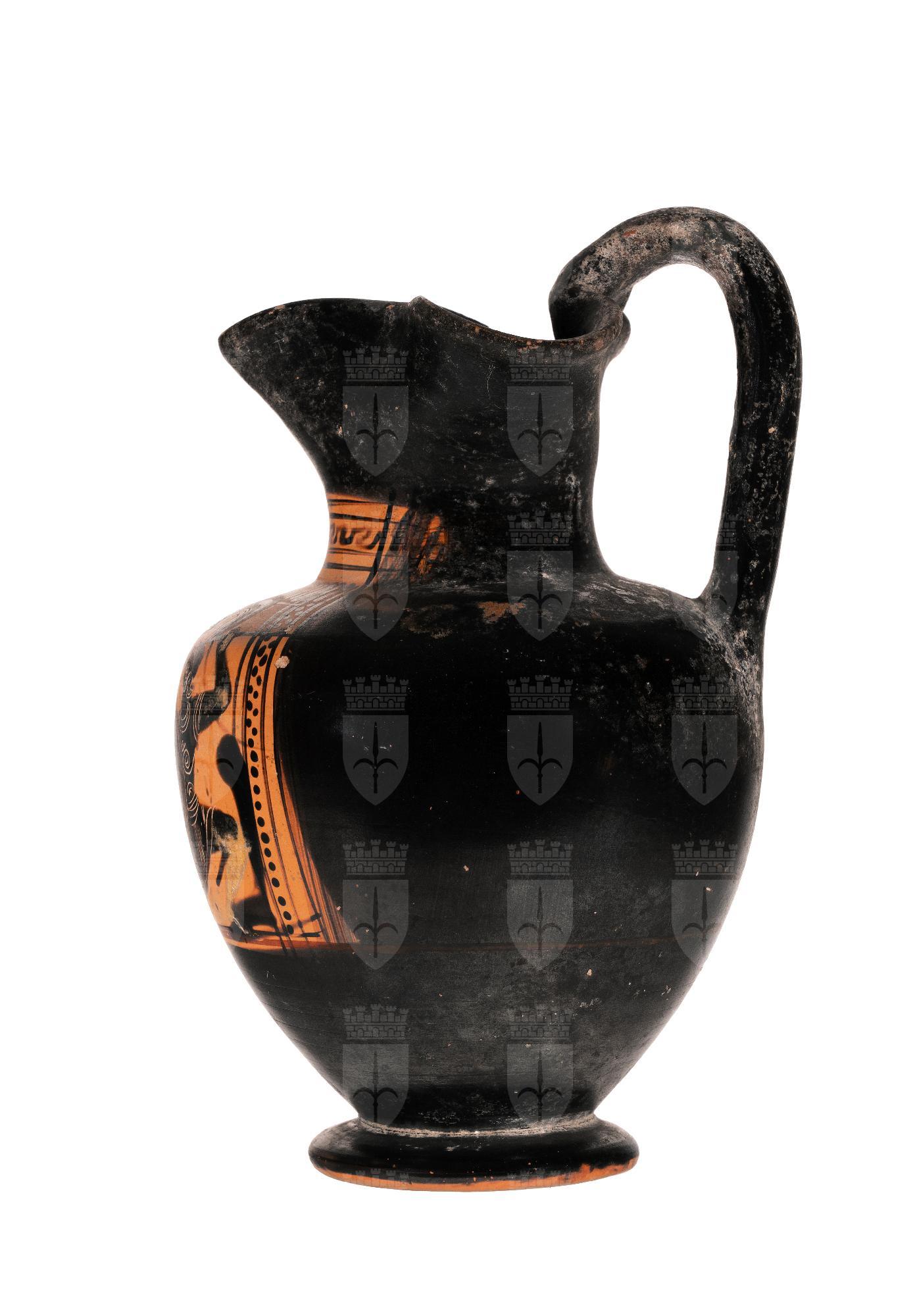 Oinochoe a figure nere con colori aggiunti e graffito: scena di Eracle che combatte contro una amazzone. Eracle, con indosso tunica, pelle di leone e schinieri, armato di clava aggredisce una amazzone, che piegata sul ginocchio sinistro, armata di elmo attico, corazza e schinieri, brandisce la lancia e uno scudo rotondo con al centro una gamba umana. Lo sfondo roccioso è reso a macchie indistinte.