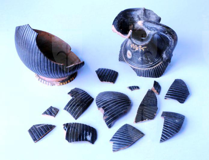 Oinochoe con attacco d'ansa a testa di capra (o pecora? Non leggibile); vernice nera sovraddipinta; sul collo pende da una tenia appesa ad una ghirlanda d'edera in corimbi una larva femminile con capelli avvolti nella mitella. In frammenti, da restaurare.