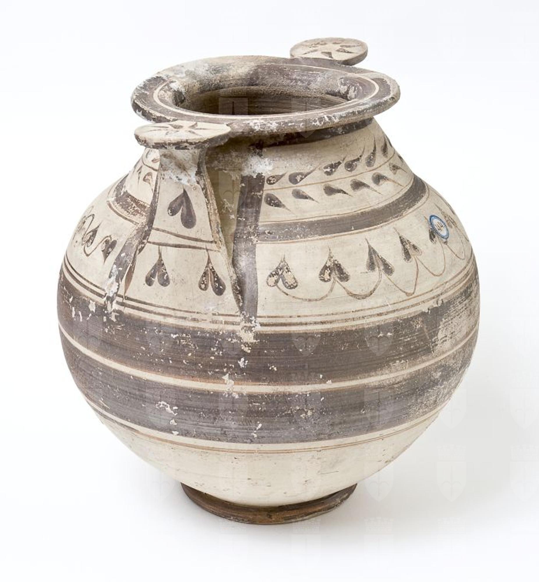 Olla in ceramica messapica con due anse verticali in forma di scalpello unite al labbro mediante rotella. Basso collo troncoconico a profilo convesso, corpo globoso, piede a disco. Decorazione monocroma in bruno su fondo di argilla naturale, su entrambi i lati: sul collo, riquadro con ramo di foglie lanceolate; sulla spalla, foglie lobate unite da archetti su un lato, serti con foglie d’edera sull’altro; sul ventre, fasce di colore bruno; sulle rotelle, giro di foglie uscenti dal centro di esse; sulle anse, due riquadri separati da doppie linee parallele, con serti d’edera; orlo e piede interamente dipinti.