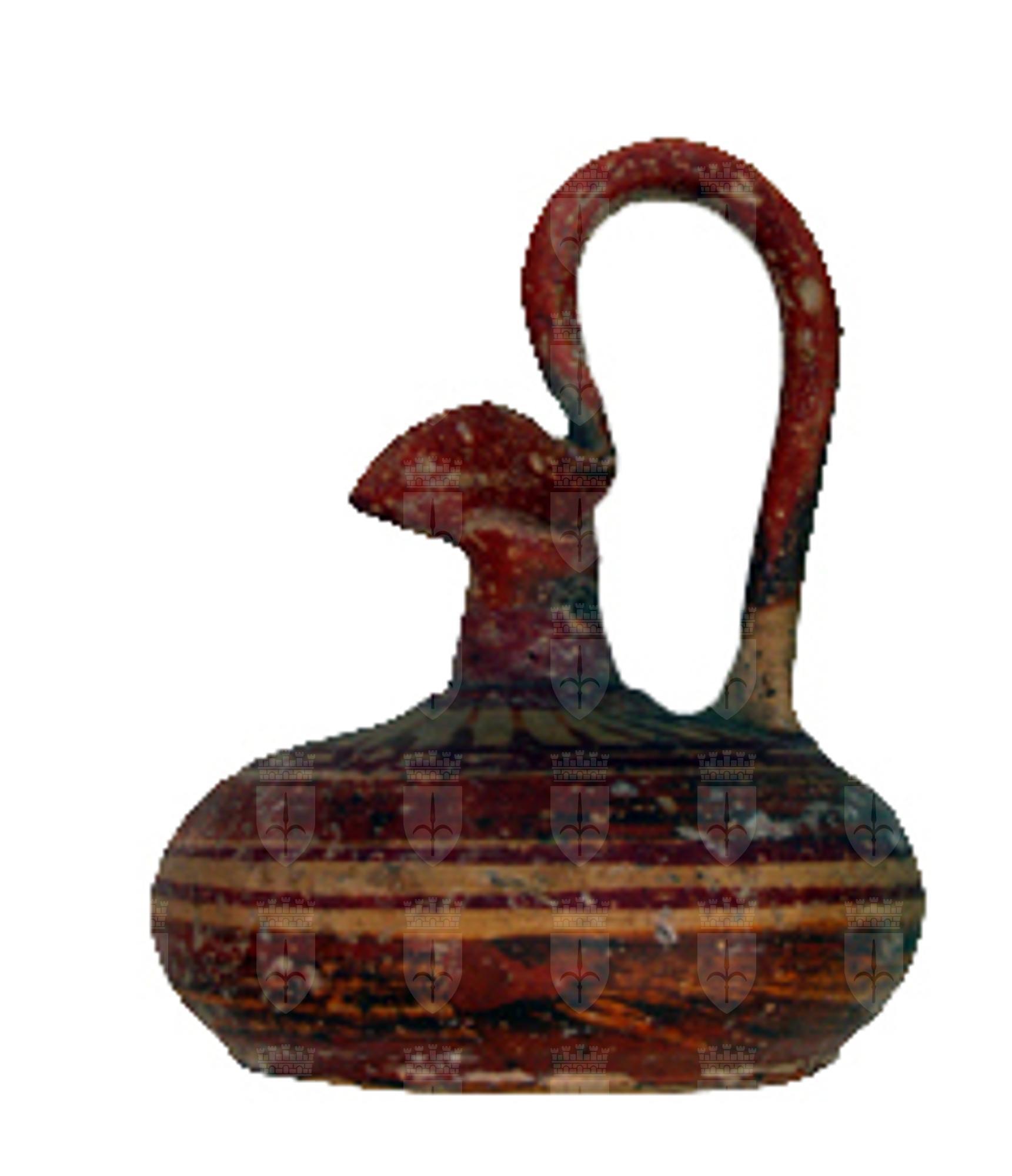 Olpe miniaturistica con ventre globulare compresso, collo stretto, bocca trilobata ed alta ansa verticale sopraelevata a nastro; decorazione a fasce e raggiera.