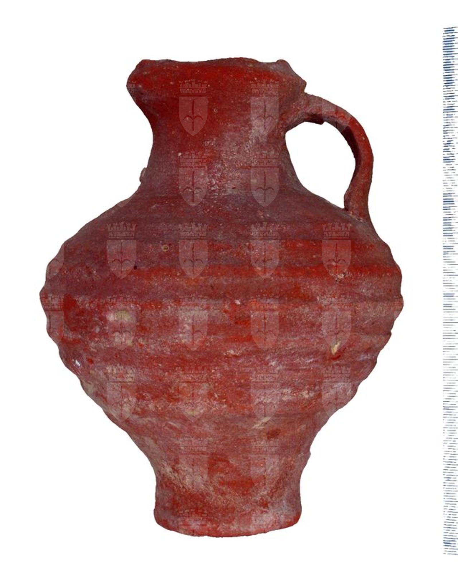Piccola olpe n argilla grezza con piede leggermente allargato, corpo biconico decorato da scanalature sul ventre e con una piccola ansa a nastro; orlo leggermente proteso a formare un beccuccio.