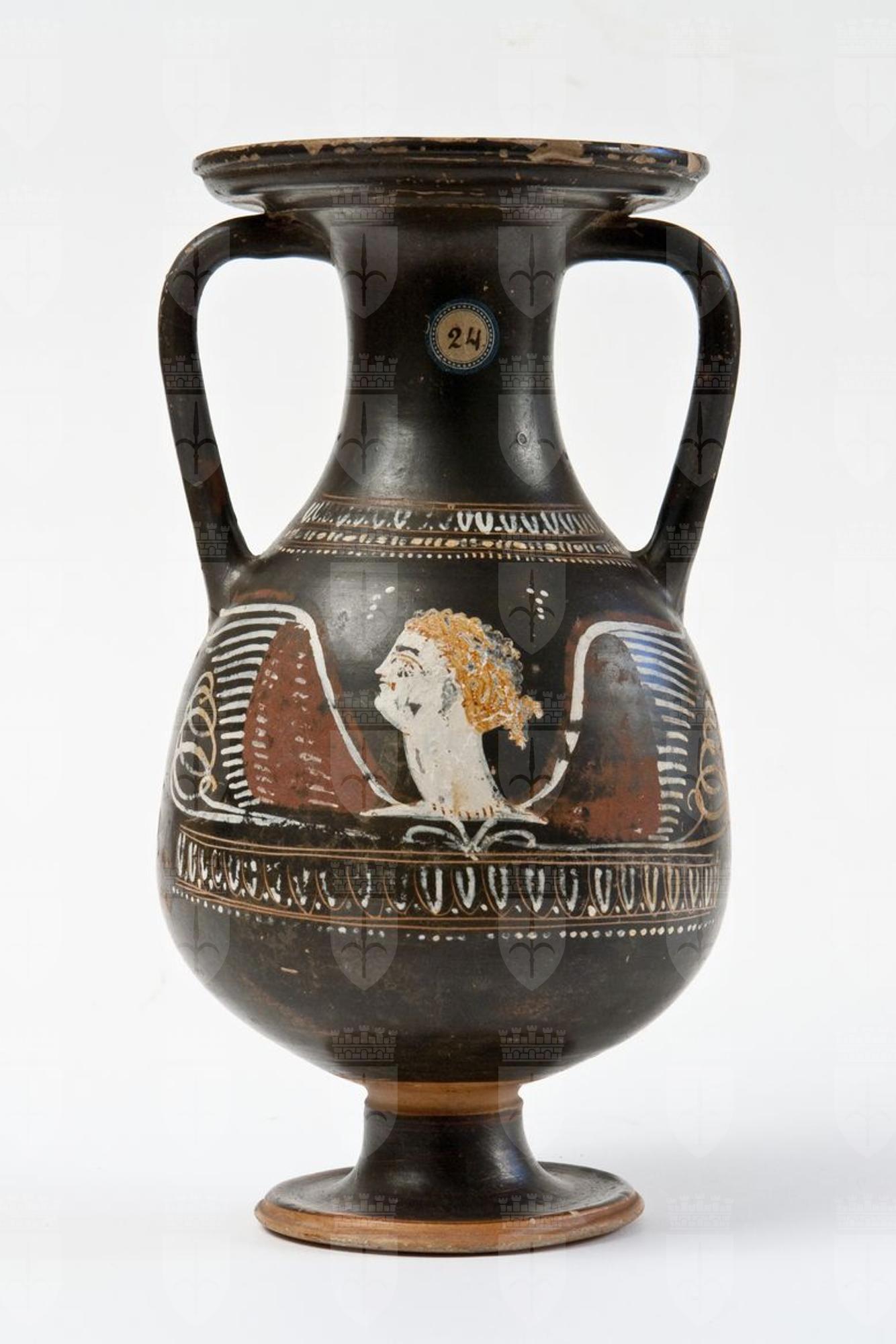 Pelike a vernice nera, a tratti tendente al rosso, con sovraddipinture in bianco, giallo e rosso amaranto ed incisioni. Labbro revoluto, orlo estroflesso e modanato, stretto collo a profilo concavo, corpo globulare rastremato verso l’alto, anse a bastoncello oblique, piede campanulato con taglio modanato. A: Alla base del collo, tra tre coppie di linee incise sequenza di ovuli, dipinti con punti in bianco, astragali e fila di punti in giallo; sul corpo erote alato, di profilo verso sinistra: soltanto la testa, dipinta in bianco crema con dettagli in giallo, tra due ali, decorate di rosso amaranto e rifinite in bianco e giallo, nascente da un fiore campanulato, in bianco, e tra complessi di girali, in giallo. Alla base del corpo: sequenza di ovuli incisi e dipinti con punti, tra due coppie di linee incise, ed infine fila di punti bianchi. B: Rosetta con bottone centrale e petali triangolari campiti in giallo su base bianca, inquadrata da due rami secchi, con stelo inciso, pendenti e ricurvi verso l’esterno.