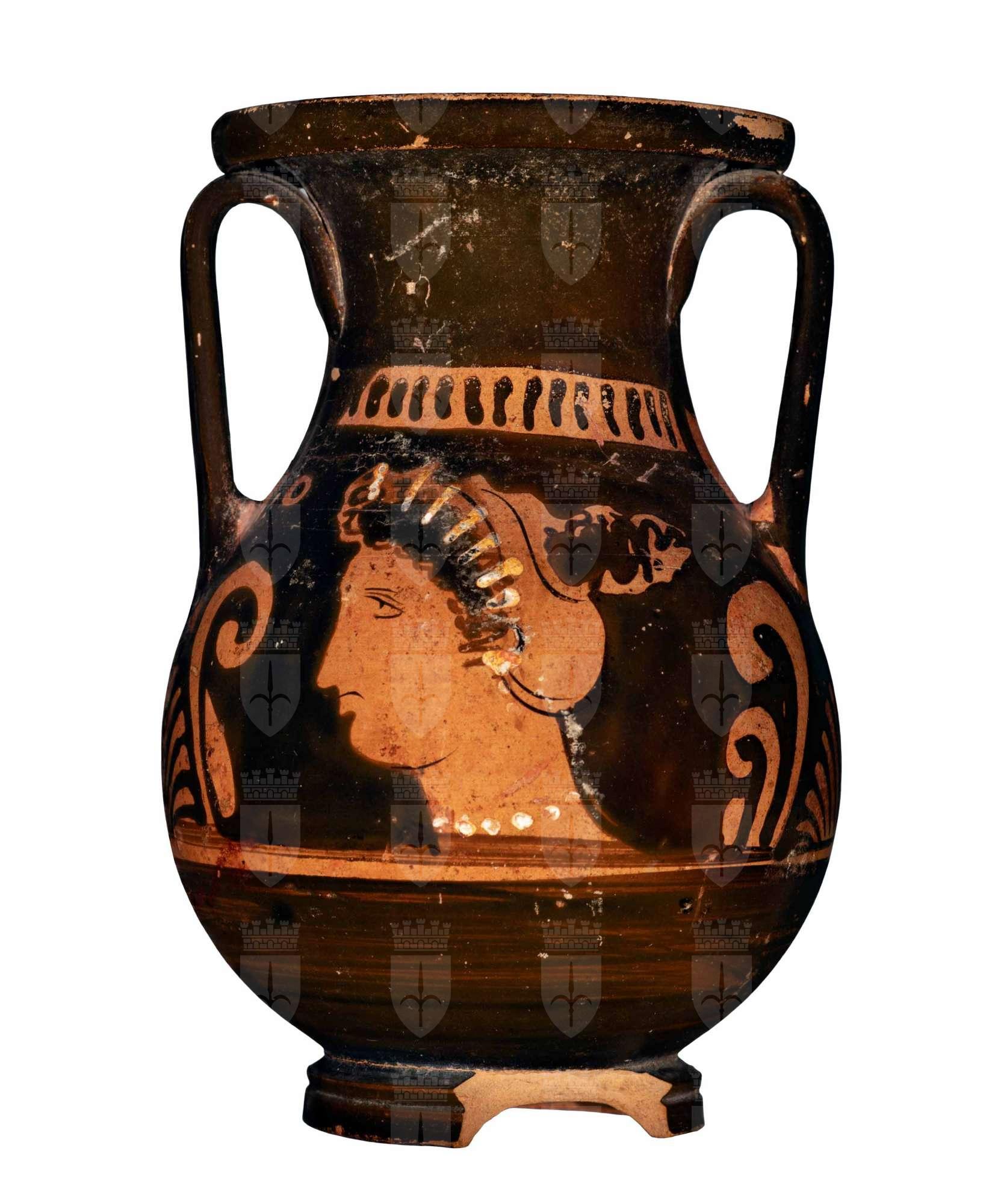 Orlo revoluto su collo a profilo concavo; spalla obliqua; corpo ovoide, distinto da una sottile linea graffita; anse verticali a nastro con lievissima costolatura mediana, impostate tra collo e spalla; Lato A: testa femminile con stephanè Testa femminile di profilo rivolta verso sinistra. Fronte e naso costituiti da un’unica linea continua; mezzo di una breve linea a vernice nera tendente verso il basso. Il mentoè abbastanza stondato. Un sakkòs, decorato sulla nuca con una corona di linguette e lungo la circonferenza da una doppia linea continua a vernice nera diluita e da una fila di pallini in vernice nera, copre i capelli, di cui fuoriesce solo una ciocca di riccioli neri all’altezza dell’orecchio. Al sakkòs è sovrapposta una stephanè ad alti raggi in bianco e giallo sovradipinto; indossa collana ad unico filo di vaghi circolari sovradipinti in bianco (in parte evanidi) e orecchini a rosetta costituiti da tre vaghi circolari accostati, in bianco e giallo sovradipinto. Nel campo, ai due lati della testa femminile, in alto, due rosette quadripetale Lato B: testa femminile con stephanè, il disegno rimanda lo stesso del lato A.