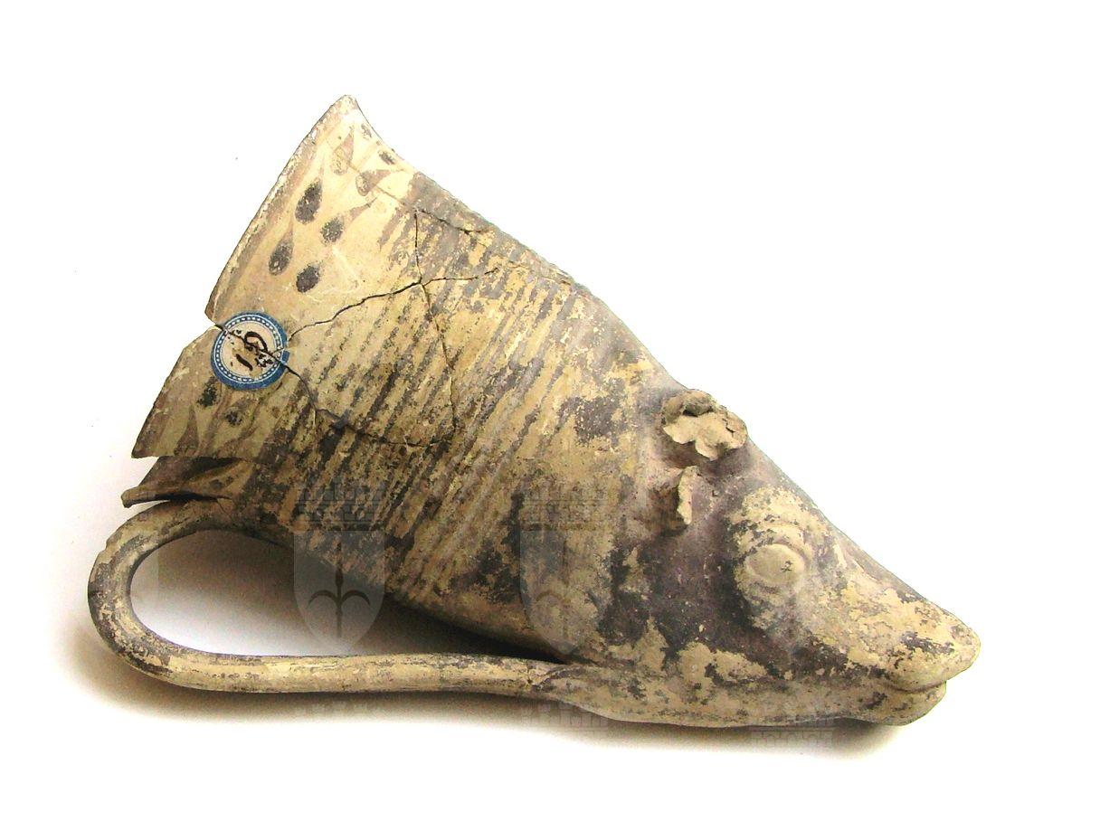 Rhyton a testa di toro arcaico verniciato di bruno con una macchia bianca tra gli occhi sulla fronte, il collo largo e tozzo è cordonato da scanalature orizzontali; lungo l'orlo dipinto un serto di foglie; ansa nastriforme.