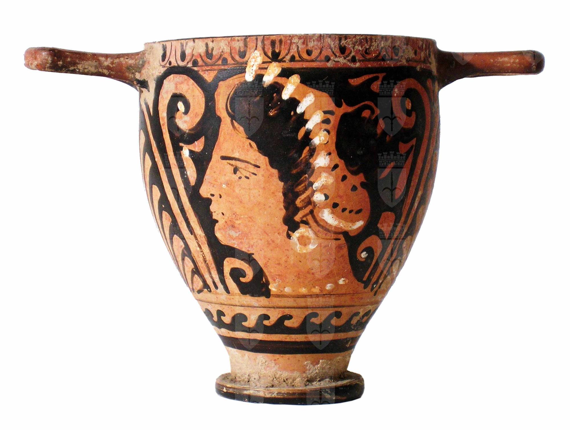 Skyphos apulo a figure rosse con dettagli bianchi a profilo concavo-convesso allungato. Lato A e B: testa femminile con mitella tra palmette.