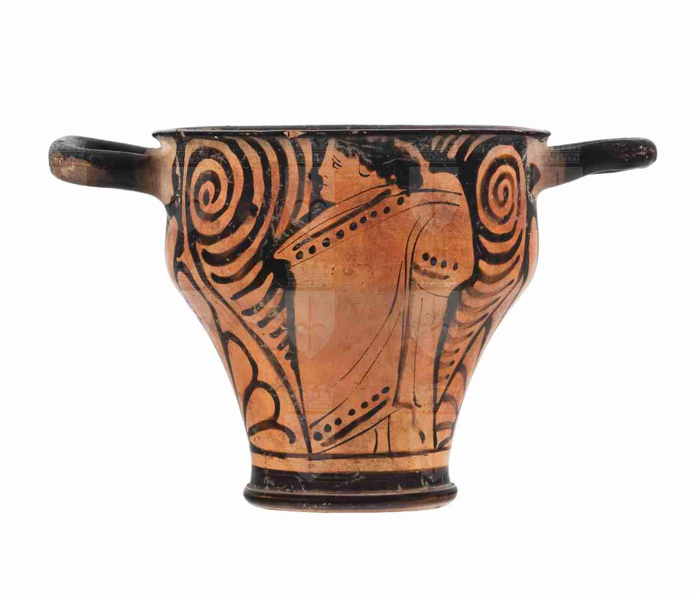 Lo skyphos presenta un corpo situliforme, con un accenno di orlo estroflesso e piede a disco semplice. Le anse a nastro si impostano orizzontalmente poco sotto l'orlo. La vernice nera, tendenzialmente opaca, è uniforme e copre interamente la vasca del vaso, il piede e le anse, risparmiandone però la base e il retro. Il colore dell'argilla varia da Munsell 7.5YR 7/6 (reddish yellow) a 2.5YR 4/6 (red). I due lati presentano una decorazione analoga e quasi simmetrica, con la tozza figura di un giovane ammantato, leggermente più accurata sul lato A. il giovane è perfettamente di profilo a sinistra, con i capelli ricciuti che rica-dono sulla nuca. L'himation copre completamente le forme del corpo e presenta gli orli superiore e inferiore decorati da una fascia nera e una fila di punti; sul lato A il drappeggio del mantello è più accurato e la decorazione più ricca. La decorazione accessoria è composta da palmette sotto le anse, affiancate da coppie di elementi vegetali a foglia con estremità a spirale, estesi fino a fare da sfondo alle figure ammantate. Sotto al piede è presente una decorazione composta da tre cerchi concentrici in nero. Sotto il piede si conserva una vecchia etichetta, recante un precedente numero di inventario ('550') ed è scritto l'attuale numero di inventario generale. Sul lato B, sulla figura, si intravede una scritta, quasi illeggibile ('347').