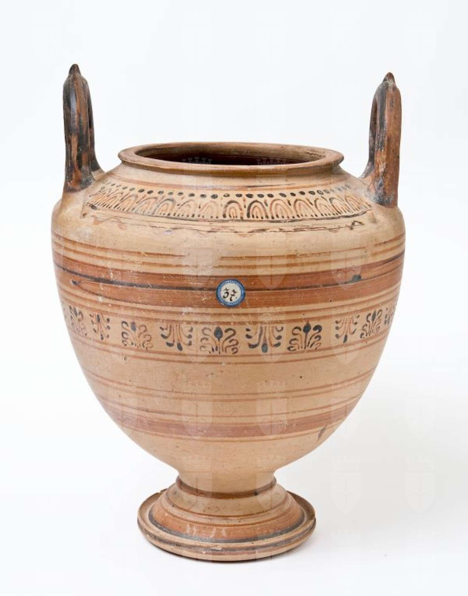 Stamnos con corpo globoso, rastremato verso il basso. Labbro svasato e orlo appiattito, larga imboccatura, anse verticali sormontanti impostate sulla spalla a profilo teso, con piede a tromba modanato con base a disco. Decorazione in bruno e rosso diluito, su fondo acromo: sulla spalla, un fregio inquadrato da due filettature e costituito da una fila di cerchi pieni e una di ovoletti a linee concentriche, separati da linee verticali, altre due linee concentriche parallele, con motivo a tremolo; sul corpo, linee e fasce di diverso spessore disposte sull’intera superficie, con fregio di palmette alternate; sul piede, linee e fasce di diverso spessore; dipinti l’orlo e le anse.