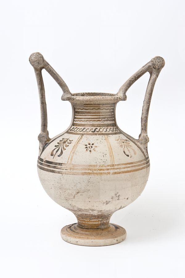 Trozzella in ceramica messapica. Orlo estroflesso e appiattito, alto collo cilindrico, a profilo leggermente concavo, corpo globoso, con anse verticali sormontanti, impostate sull’orlo e sulla spalla, provviste di doppia coppia di dischi (“trozze”), di cui quelli superiori sono di maggiori dimensioni; piede a disco, unito al corpo mediante un piccolo fusto. Decorazione monocroma in nero su fondo naturale di argilla; su entrambi i lati, sul collo, linee orizzontali diritte e a tremolo, con motivo a onde correnti nella fascia inferiore; sulla spalla, una serie di pannelli definiti da linee parallele, in cui campeggiano palmette e una foglia d’edera, un fiore campanuliforme e una rosa; all’altezza del ventre, una fascia a tre linee parallele; sul fusto del piede, fasce; sull’orlo, tratti; sui dischi linee radiali.