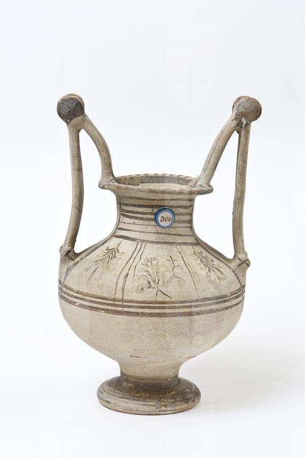 Trozzella in ceramica messapica. Orlo estroflesso e appiattito, alto collo cilindrico, a profilo lievemente concavo, corpo globoso, con anse verticali sormontanti, impostate sull’orlo e sulla spalla, provviste di doppia coppia di dischi (“trozze”), di cui quelli superiori sono di maggiori dimensioni; piede a disco, unito al corpo mediante fusto. Decorazione monocroma in bruno-nerastro, su fondo naturale di argilla, con piede dipinto in bruno; sul collo, linee orizzontali diritte; sulla spalla, una serie di pannelli definiti da linee parallele, in cui su un lato campeggiano palmette isolate, mentre sull’altro un ramo di ulivo. All’altezza del ventre una fascia a tre linee parallele; sulla parte inferiore del fusto, fasce e piede dipinto; sull’orlo, tratti; sulle anse, linee verticali, dischi superiori dipinti, sui dischi inferiori, linee incrociate.