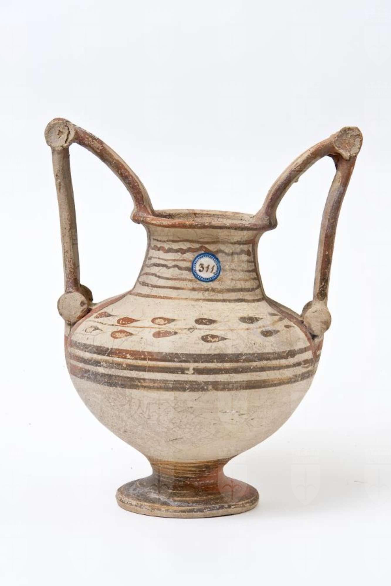Trozzella in ceramica messapica. Orlo estroflesso e appiattito, alto collo cilindrico, a profilo lievemente concavo, corpo globoso, con anse verticali sormontanti, impostate sull’orlo e sulla spalla, provviste di doppia coppia di dischi (“trozze”) di eguali dimensioni; piede a disco, unito al corpo mediante fusto. Decorazione monocroma in rosso, su fondo naturale di argilla, con piede e fusto interamente dipinti; sul collo, linee orizzontali diritte e “a tremulo”; sulla spalla, un ramo d’ulivo in entrambi i lati. All’altezza del ventre una fascia a tre linee parallele; sull’orlo, tratti; sulle anse, linee verticali.