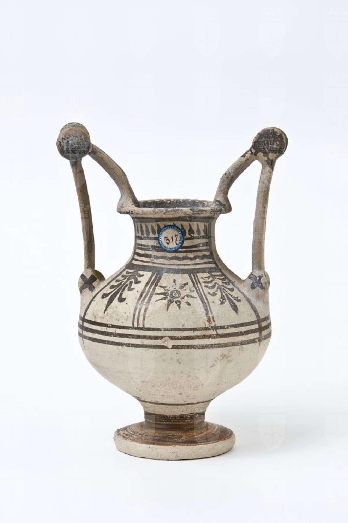 Trozzella in ceramica messapica. Orlo estroflesso e appiattito, alto collo cilindrico, a profilo leggermente concavo, corpo globoso, con anse verticali sormontanti, impostate sull’orlo e sulla spalla, provviste di doppia coppia di dischi (“trozze”), di cui quelli superiori sono di maggiori dimensioni; piede a disco, unito al corpo mediante un piccolo fusto. Decorazione monocroma in bruno su fondo naturale di argilla, con piede dipinto; risparmiata la costa laterale del piede; sul collo, linee orizzontali diritte con motivo a pendenti nella fascia superiore e a onde correnti in quella inferiore; sulla spalla, una serie di pannelli definiti da linee parallele, in cui su un lato campeggiano due palmette rivolte verso il basso e un sole (o rosetta) al centro, mentre sull’altro un ramo di ulivo. All’altezza del ventre, una fascia a tre linee parallele; sul fusto del piede, fasce e una linea; sull’orlo, tratti; sui dischi linee radiali.