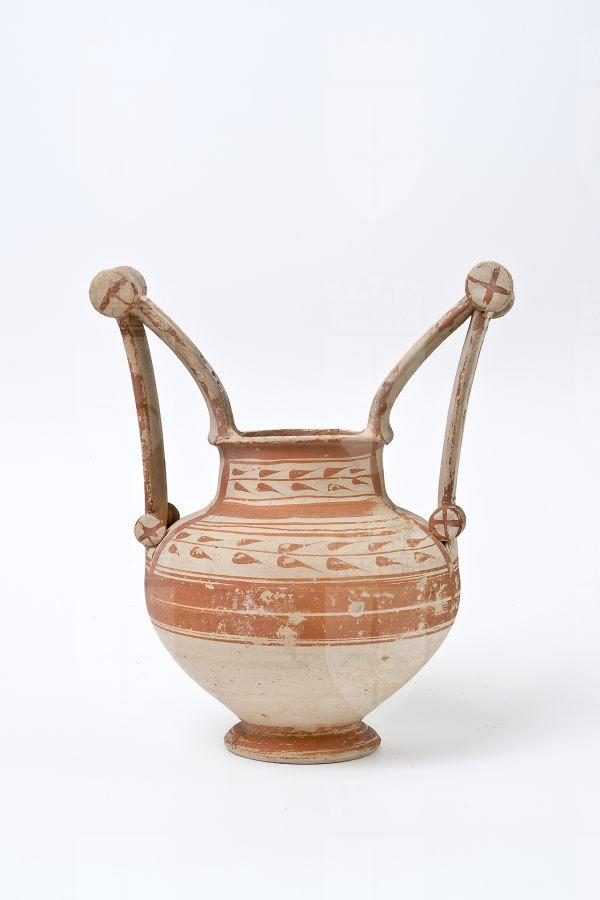 Trozzella in ceramica messapica. Orlo estroflesso e appiattito, basso collo troncoconico, corpo globoso rastremato verso il basso, con anse verticali sormontanti, impostate sull’orlo e sulla spalla, provviste di doppia coppia di dischi (“trozze”), di cui quelli superiori sono di maggiori dimensioni; basso piede a disco. Decorazione monocroma in rosso su fondo naturale di argilla; su entrambi i lati, pannelli sul collo e sulla spalla inquadrati da fasce parallele, in cui campeggiano tralci d’edera stilizzati; sull’orlo, tratti; parte inferiore del vaso risparmiata; sulle anse, linee verticali; sulle rotelle, quattro linee radiali.
