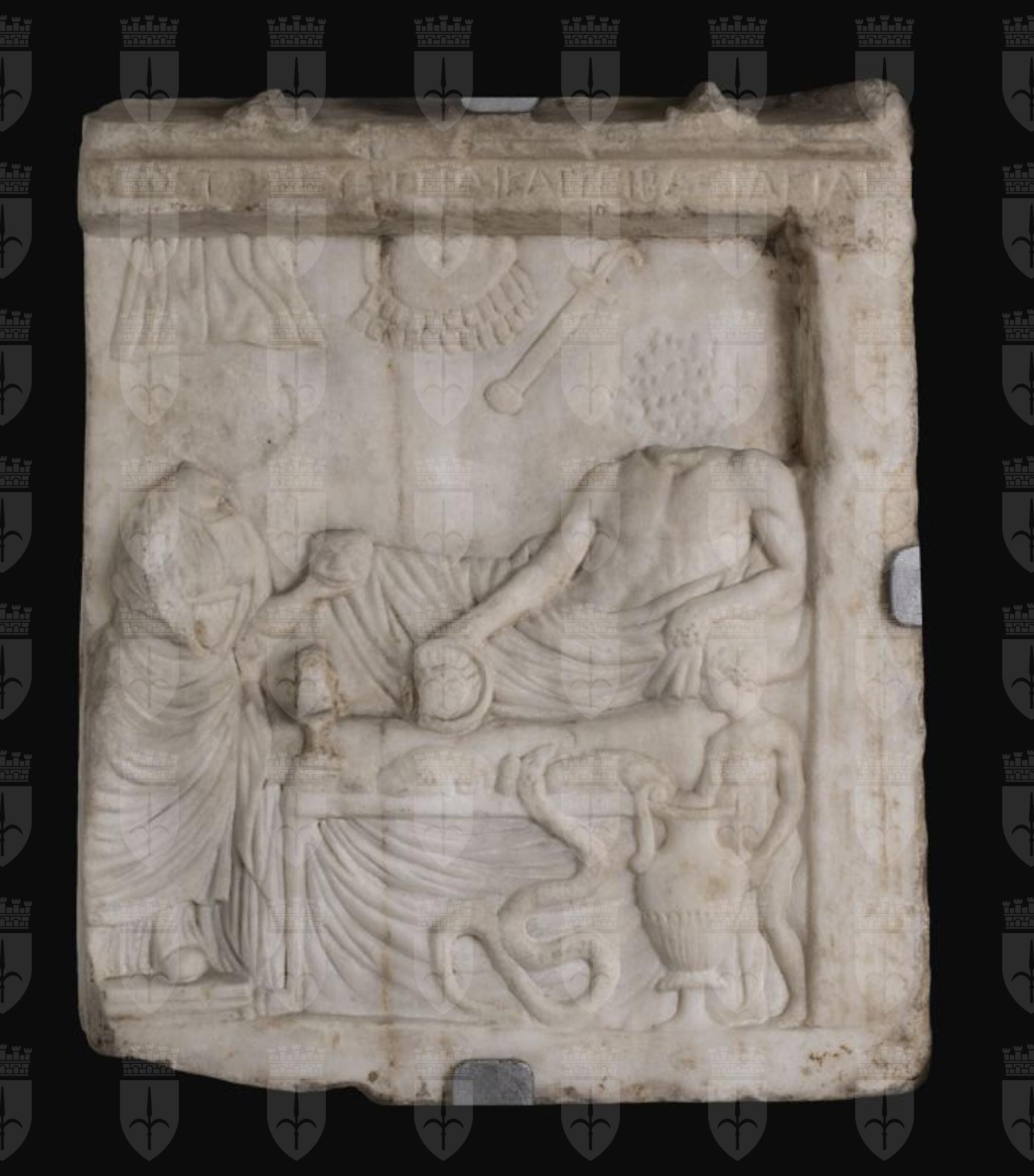 Un tempo il rilievo era conservato nella chiesa di Sant'Elia ad Atene (de Caylus). Non sappiamo esattamente quando fu acquisito dall'Accademia degli Arcadi Sonziaci, che sicuramente ne era già in possesso nel 1803, epoca a cui risale il catalogo fatto redigere dall'arcade G. de Coletti. Per tentare di ricostruire la condizione originale del monumento e delinearne quindi la tradizione possiamo partire dal disegno edito in DE CAYLUS 1764, pp. 178-179, tav. 55, nr. 1, nel quale la lastra, ancora conservata ad Atene, presenta i personaggi del rilievo ancora dotati delle teste originali. La semplificazione del rilievo - il mantello e la corazza sono divenuti ghirlande, mentre la spada è diventata una sorta di falcetto - risalgono probabilmente allo stesso de Caylus piuttosto che allo schizzo, da cui il disegno deriva, opera dell'abate Fourmont, che ha visto il pezzo ad Atene. La spada divenuta una sorta di falcetto a sinistra, sopra la kline su cui sta distesa una donna, ci dice che probabilmente il disegno è stato copiato invertendolo (vd. la discussione, anche a proposito dell'iscrizione posizionata nel disegno del de Caylus in modo diverso da quello della pietra, in CONZE 1872, pp. 320-325 che ha riconosciuto l'identità tra il pezzo di de Caylus e quello triestino). Le teste originali dovevano comunque essere già rovinate se nello schizzo non era chiaramente individuabile il sesso dei due personaggi. Dal disegno settecentesco si passa poi all'album del 1803 fatto redigere da G. de Coletti, primo bibliotecario e membro degli Arcadi Sonziaci, per illustrare la collezione di antichità (vere e false) degli Arcadi stessi. In questo disegno la testa del personaggio maschile risulta rilavorata e trasformata in una sorta di Giano bifronte coronato (si legge "Giano pacifico" accanto alla testa), mentre quella della donna presenta un'acconciatura elaborata con uno chignon piuttosto evidente, secondo stilemi prettamente classicistici. Se pensiamo che le teste originali fossero piuttosto danneggiate, non è escluso che si sia deciso di scalpellarle e di applicare poi due pezzi posticci. Conforta quest'ipotesi il tipo di scalpellatura ancora visibile, chiaramente destinata a permettere una migliore applicazione delle "integrazioni", come si riscontra anche in altri monumenti della stessa collezione. Da questo momento in poi le edizioni, che si situano nella seconda metà dell'Ottocento (Conze, Pervanoglu), ci mostrano il rilievo con l'uomo bifronte e la donna acefala (probabilmente la testa si staccò o fu ritenuta troppo palesemene posticcia). Alla fine del secolo si deve probabilmente all'allora direttore A. Puschi la decisione di eliminare le parti moderne nei monumenti antichi conservati nel Museo Tergestino. Il rilievo risulta così senza più le teste applicate nelle riprese fotografiche dell'EA, che si datano prima del 1893. Dal disegno del catalogo del de Coletti e dal confronto con il testo del Caylus è evidente che, nel momento in cui le due teste furono applicate, fu rilavorata in diversi punti come l'iscrizione. Le prime lettere conservate dell’iscrizione sono la parte finale del nome del dedicante, che dovevano trovarsi nella metà perduta del rilievo, quella che comprendeva la successione di offerenti, come è usuale su questo tipo di raffigurazioni. Nello schizzo del Fourmont, ripreso dal de Caylus, si legge ASIOS, segno che la frattura era inferiore rispetto a quella attuale. Per quanto concerne infine l'identificazione di Zeuxippos e Basileia, pare legittimo riconoscervi un'epiclesi di Ade e Persefone. Per quanto ne sappiamo esiste solo un'altra dedica a Zeuxippos incisa sopra un frammento di rilievo con eroe recumbente, trovata a Corinto (SEG, XI, 1950, 125 e CANCIANI 1997, VIII/1, p. 488, nr. 2.* con bibliografia precedente).