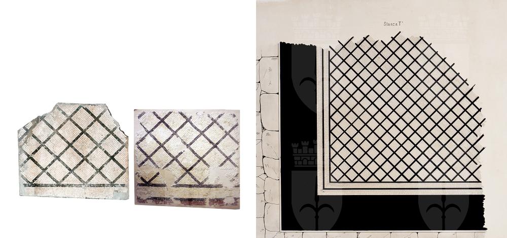 Due pannelli del mosaico della seconda fase edilizia appartenuto all’ambiente T’, munito di un’alcova in muratura, ove erano i letti, e di un sedile, che si trovava tra il portico panoramico e l’esedra, e aveva questo pavimento a mosaico con disegno a reticolato di quadrati disposti in diagonale, nero su fondo bianco; cornice a fascia bianca tra linee nere.