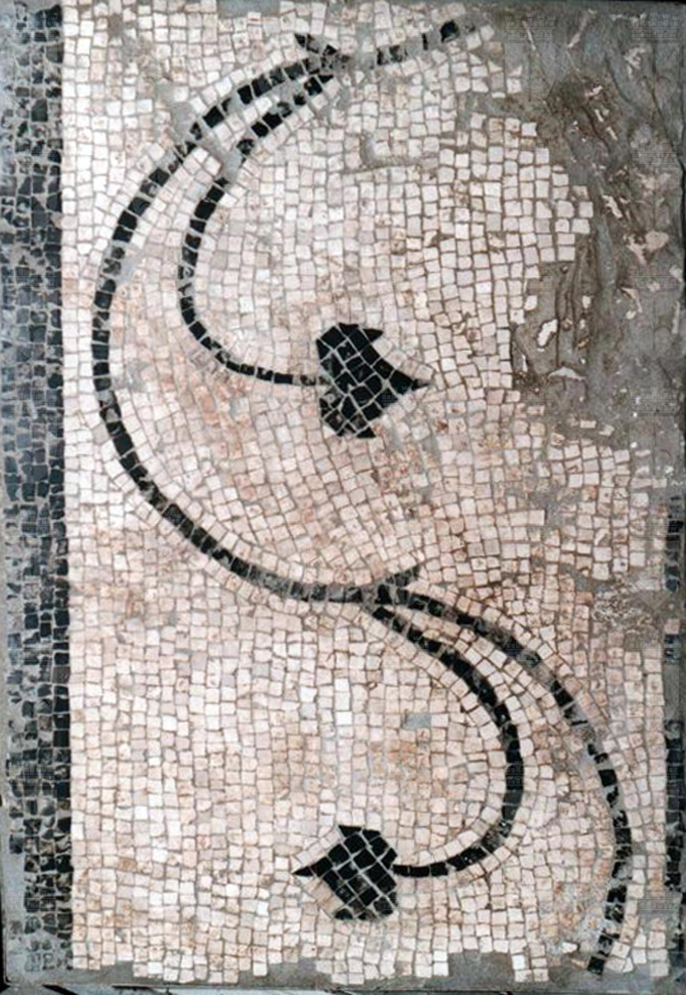 Pannello del mosaico di Seconda fase edilizia dalla porta del triclinio (sala da pranzo) che aveva, verso il peristilio, una soglia con questo mosaico decorato in nero su fondo bianco da due tralci d’edera che si dipartono da un vasetto posto al centro.