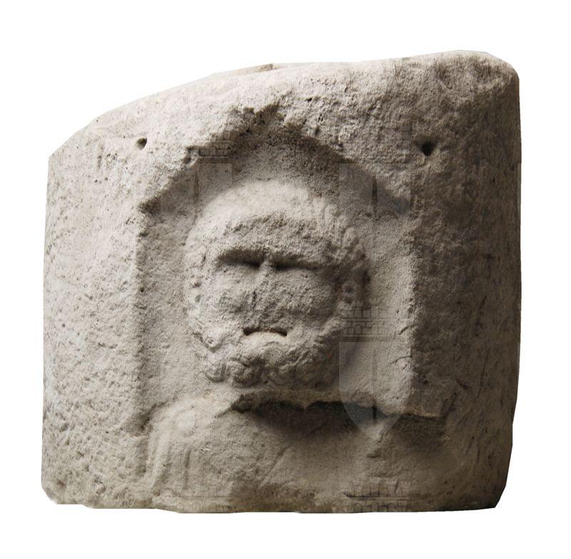 Il blocco, appena sbozzato, mostra un rilievo di esecuzione piuttosto grossolana raffigurante una testa barbuta riferibile probabilmente a Ercole.