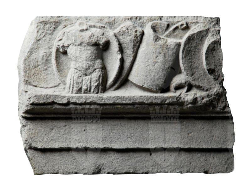 Sopra l’architrave, articolata in due fasce, una cornice con listello e gola rovescia, e un fregio d’armi a rilievo continuo. Da sinistra: un clipeus, visto internamente, con davanti una corazza anatomica con maniche a strisce di cuoio e una fila di pteryges terminanti a frangia; uno scudo rettangolare; uno scudo semicilindrico; un oggetto indefinibile (forse un drappeggio?) e due clipei sovrapposti. Contiguo a inv. 14369