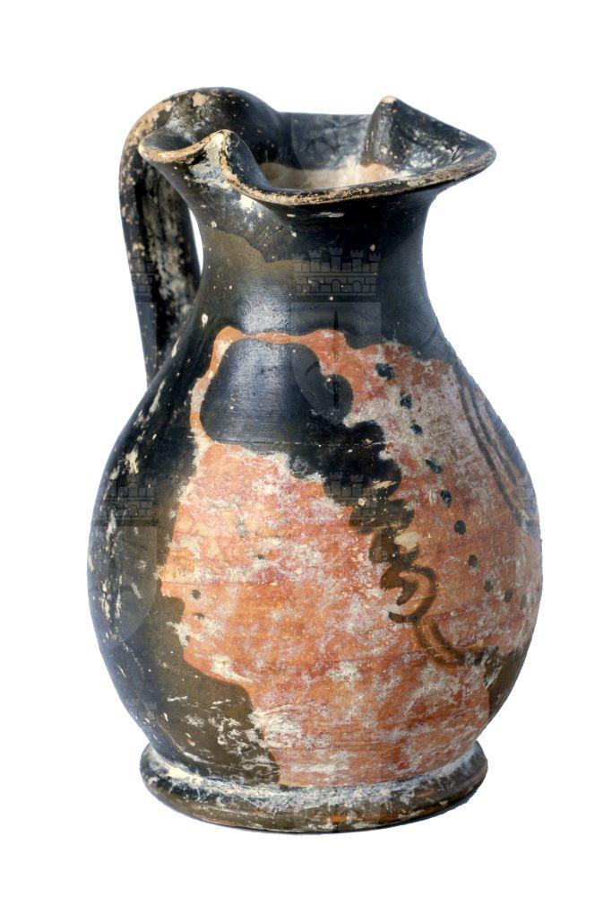 Oinochoe apula a figure rosse con testa femminile.