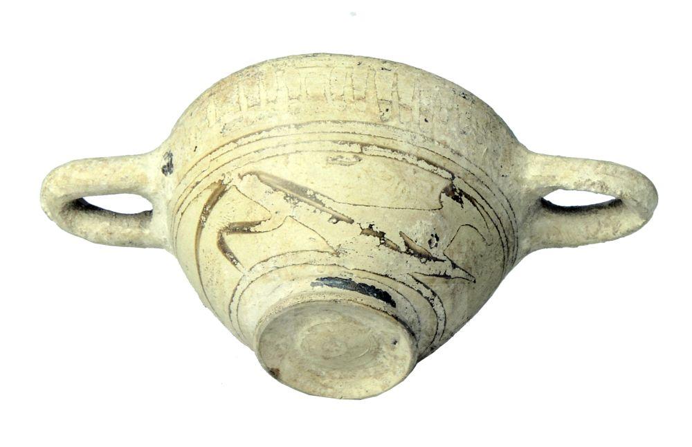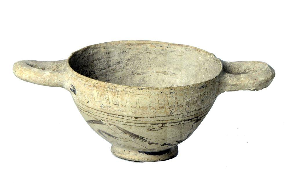 Skyphos miniaturistico corinzio a fasce con decorazioni figurate molto evanidi: due animali in corsa.