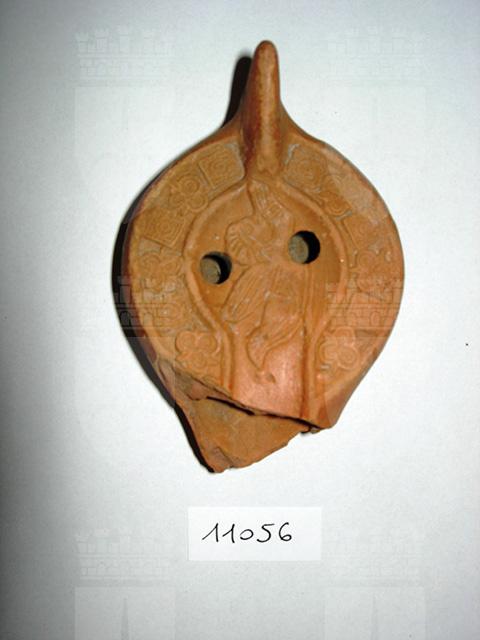Lucerna africana. Ansa piena, puntuta. Nel disco concavo, a due «infundibula» obliqui, tozza figura d'uomo o erote alato volto a destra. Sulla spalla sette decorazioni geometriche per parte: quadri e fiori trilobati alternati ed una perla all'altezza del canale. Sottofondo piatto con piedino circolare al cui centro due circonferenze concentriche incise.