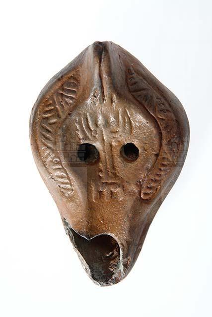 Lucerna africana mancante di parte del becco. Realizzata in terracotta di colore nocciola e priva di vernice, presenta nel campo concavo, tra i due infundibula orizzontali, un Menorà, candelabro a sette bracci con base tripode. Sull'orlo fasce con impresse linee tracciate in varie direzioni. Ansa piena scanalata, fondo concavo, con tre incavi circolari uno dei quali con un punto nel centro, a cui giunge, proveniente dall'ansa, una doppia scanalatura terminante in volute.