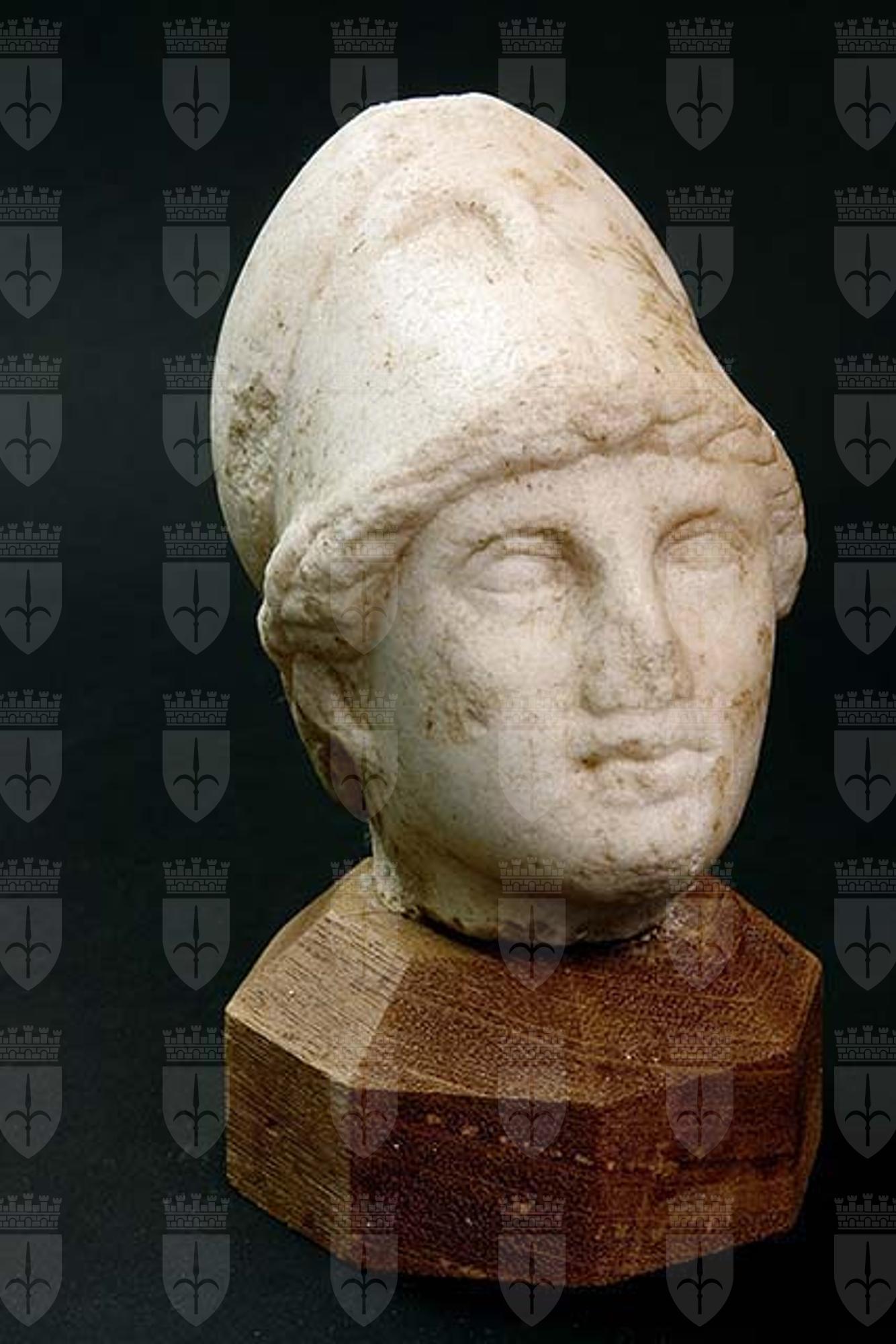 Piccola testa leggermente voltata a destra, dal volto pieno con occhi infossati e allungati tra palpebre a nastro sopracciglia appena arcuate; naso dal dorso piatto con radice larga avvicinata alla bocca, morbidamente serrata. I capelli a ciocche ondulate emergono sotto l'elmo corinzio, che presenta un piccolo foro alla sommità per sostenere il lophos.