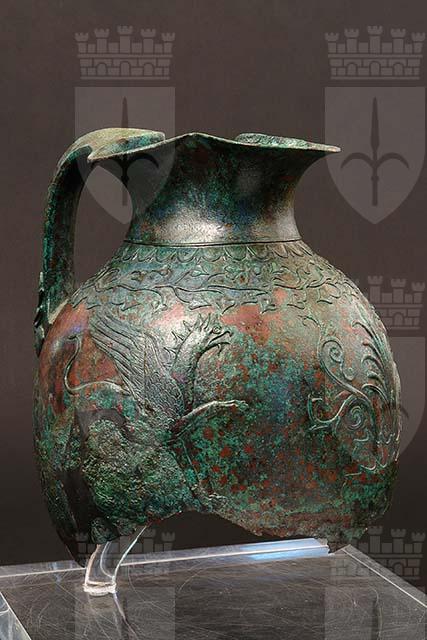 Oinochoe a bocca trilobata, corpo ovoidale, privo del piede e di gran parte del fondo. La decorazione alla Base del collo mostra kymation ionico con ovuli e dardi, sormontati da un listello a rilievo. Sulla spalla, un serto orizzontale ondulato con foglie d'edera cuoriformi appuntite. Sulla fronte del ventre una palmetta a 9 foglie nasce da un cespo d'acanto. Simmetricamente contrapposti, rivolti verso la palmetta, stanno due grifoni stanti, alati e crestati, con zampe e coda leonine, lunga testa dal becco adunco e barbula. Realizzata a parte e legata con saldatura a stagno (brasatura dolce), l'ansa è piena, a sezione triangolare, con attacco inferiore configurato a due mezze teste di cervo viste di profilo e affrontate. Circa la produzione, è stato proposto trattarsi di una delle più antiche elaborazioni tarantine sulla base di modelli attici, altri paralleli stilistici riconducono alle produzioni del Mar Nero.