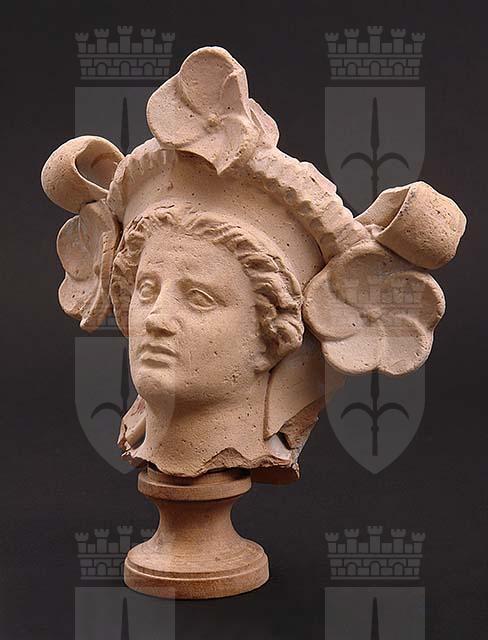 Testa di recumbente dal retro stondato con foro ovale per l'areazione. Volto dalle guance piene, occhi e naso grandi, fronte alta; folta chioma ondulata su cui è un diadema a cercine adorno di rose e bende.