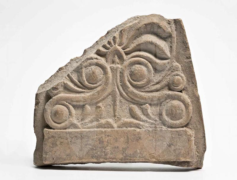 Argilla di color beige, in frattura argilla rosata. Una base in forte rilievo sostiene le doppie volute, dalle quali spunta la palmetta; l'elemento da cui si dipartono i petali è sostenuto da una specie di lungo stelo rigido. Presenta una spessa lastra alla base, le volute contengono un largo bottone, i petali sono piuttosto grossi e con nervatura centrale. Non si conosce l'esatta provenienza del pezzo.