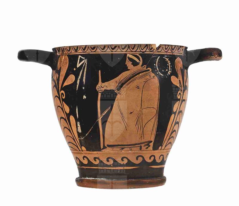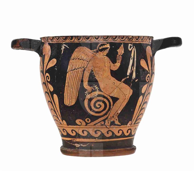 Il vaso presenta un corpo di forma troncoconica dal profilo leggermente convesso, rialzato su un piede ad anello dal profilo convesso e con listello, con tracce di vernice nera. Le anse a nastro sono impostate orizzontalmente poco sotto l'orlo, leggermente estroflesso. La vernice nera, opaca, copre interamente anche l'interno della vasca del vaso. Alcuni dettagli, come sulle ali dell'erote, presentano sovradipinture in bianco. Il colore dell'argilla varia da Munsell 5YR 6/6 (reddish yellow) a 2.5YR 5/8 (red). Sul lato A troviamo un erote alato, rivolto a sinistra, nudo ad eccezione dei calzari, seduto su un tralcio a spirale. Porta i capelli ricciuti raccolti all'altezza della nuca, cinti da un diadema; le ali sono molto curate, con tre file di penne, le due superiori, più corte, dettagliate da piccoli tratti paralleli, quella inferiore con file verticali di punti bianchi. Regge nella mano sinistra, poggiata sul tralcio, un serto e nella sinistra, portata all'altezza del volto, uno specchio. Porta inoltre dei gioielli: una collana e una bandoliera di perle; i gioielli, il serto e lo specchio presentano dettagli sovradipinti in bianco. Compaiono, sospesi e resi in bianco, un tralcio fiorito sulla sinistra e un nastro. Sul lato B, vi è la tozza figura di un giovane ammantato, di profilo, rivolto a sinistra, rappresentato in maniera piuttosto rozza: l'himation nasconde completamente il corpo, ad esclusione del braccio e della spalla destra ed è decorato con una fascia nera presso il collo, ornato da ricche pieghe, e l'orlo inferiore. Il giovane porta i capelli corti cinti da una fascia e si appoggia ad un bastone con la mano destra. Anche su questo lato, una ghirlanda e un nastro sono sospesi sullo sfondo. La decorazione accessoria include un motivo ad ovuli pendenti subito sotto all'orlo, limitato da un filetto a ri-sparmio. Sotto le figure, inquadrato da due filetti a risparmio, dei quali quello superiore funge da appoggio alle figure stesse, un motivo ad onde marine sinistrorso. Ai lati, una grande palmetta affiancata da motivi fogliati e girali. Sotto il piede è presente una vecchia etichetta, indicante la data di acquisizione da parte del museo ('12 luglio 1905') e l'attuale numero di inventario generale.