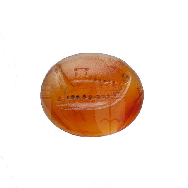 Corniola giallorossa convessa, piana con sulla parte convessa nave da guerra a destra dall'alta prora, sulla tolda un ponte