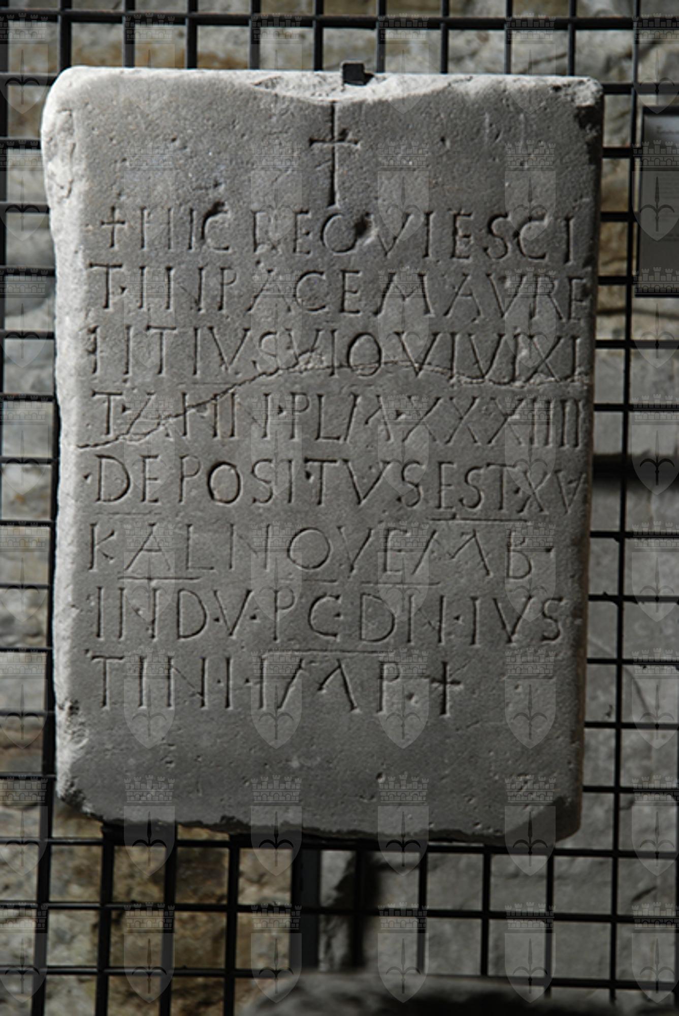 Si tratta di una lapide rettangolare scorniciata con un'iscrizione latina sepolcrale che ricorda il defunto Maurentino, vir illustris, (titolo usato nel tardo impero per indicare gli esponenti dei ranghi elevati), che morì circa all'età di 34 anni. E' inoltre esplicitato il momento della sepoltura. L'iscrizione latina si apre e chiude con l'incisione di una croce.