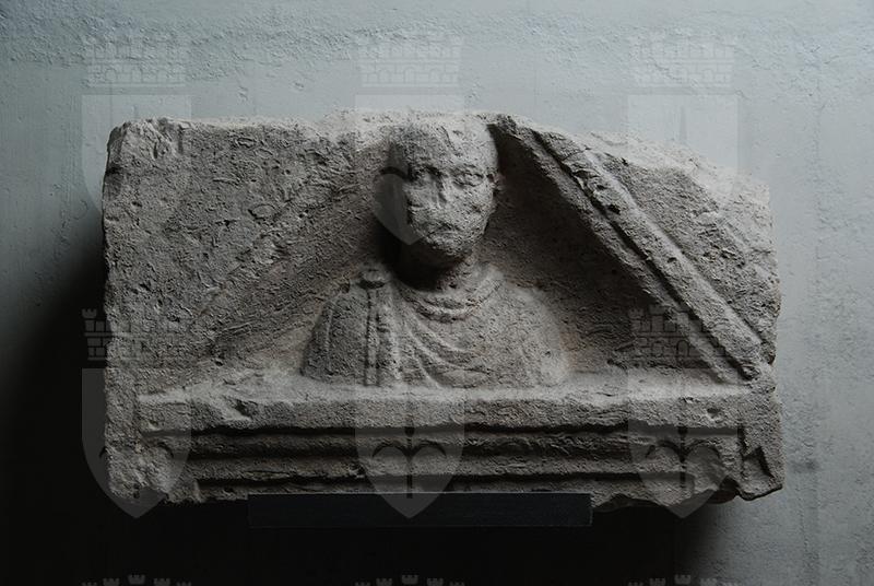Parte superiore di stele rettangolare nel quale è realizzato a sottosquadro un frontone modanato in cui è il busto di un uomo che indossa tunica e mantello, fissato alla spalla con una fibula rotonda.