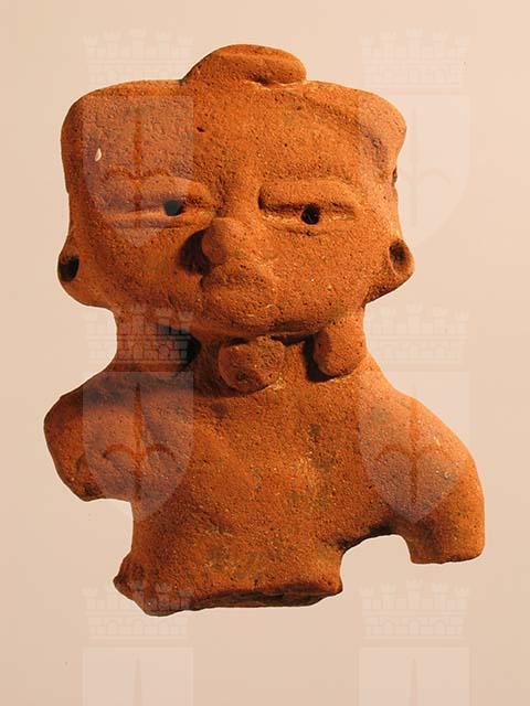 Figurina di argilla rossa di stile Usulután che rappresenta un uomo in posizione eretta. Il busto è spezzato all’altezza della vita. Manca il braccio destro e parte di quello sinistro. Il corpo della statuetta è pieno mentre la testa, cava all’interno, ospita dei pezzetti di argilla che dotano l’oggetto della funzione di sonaglio. A questo scopo sono stati praticati due fori laterali, appena sopra le orecchie, comunicanti con l’interno. Dalla vista di profilo è possibile apprezzare la posizione del volto, con il mento rivolto leggermente verso l’alto e soprattutto, la fronte piatta. Tale caratteristica rinvia probabilmente alle pratiche di deformazione cranica riservate agli individui di rango più elevato. La volontà di segnalare il prestigio è confermata anche dalla vistosa collana realizzata con tre applique sferiche sul collo, e dagli orecchini. Una fascia cinge la testa formando una sorta di turbante al centro del quale si nota, in rilievo, un elemento decorativo con una scanalatura centrale. Anche dietro la fascia del copricapo è in rilievo. Il torace è piatto. Tutta la figurina è stata ingobbiata e in parte levigata.