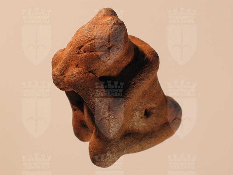 Figurina di stile Usulután di argilla rossa con tracce di ingobbiatura. Rappresenta un animale seduto sulle zampe posteriori e con le zampe anteriori poggiate sul muso. Questo è lungo e affusolato con piccole orecchie circolari poste in alto alla nuca. Gli occhi sono lunghi e appena incisi. La lavorazione della figura è cava e si notano diversi fori (sulla pancia, sui fianchi e sotto la gola) che potrebbero far pensare ad un fischietto o ad un sonaglio. L’interno tuttavia non contiene alcun materiale mobile. Per la forma del muso l’animale raffigurato sembrerebbe un cane o un coatí.