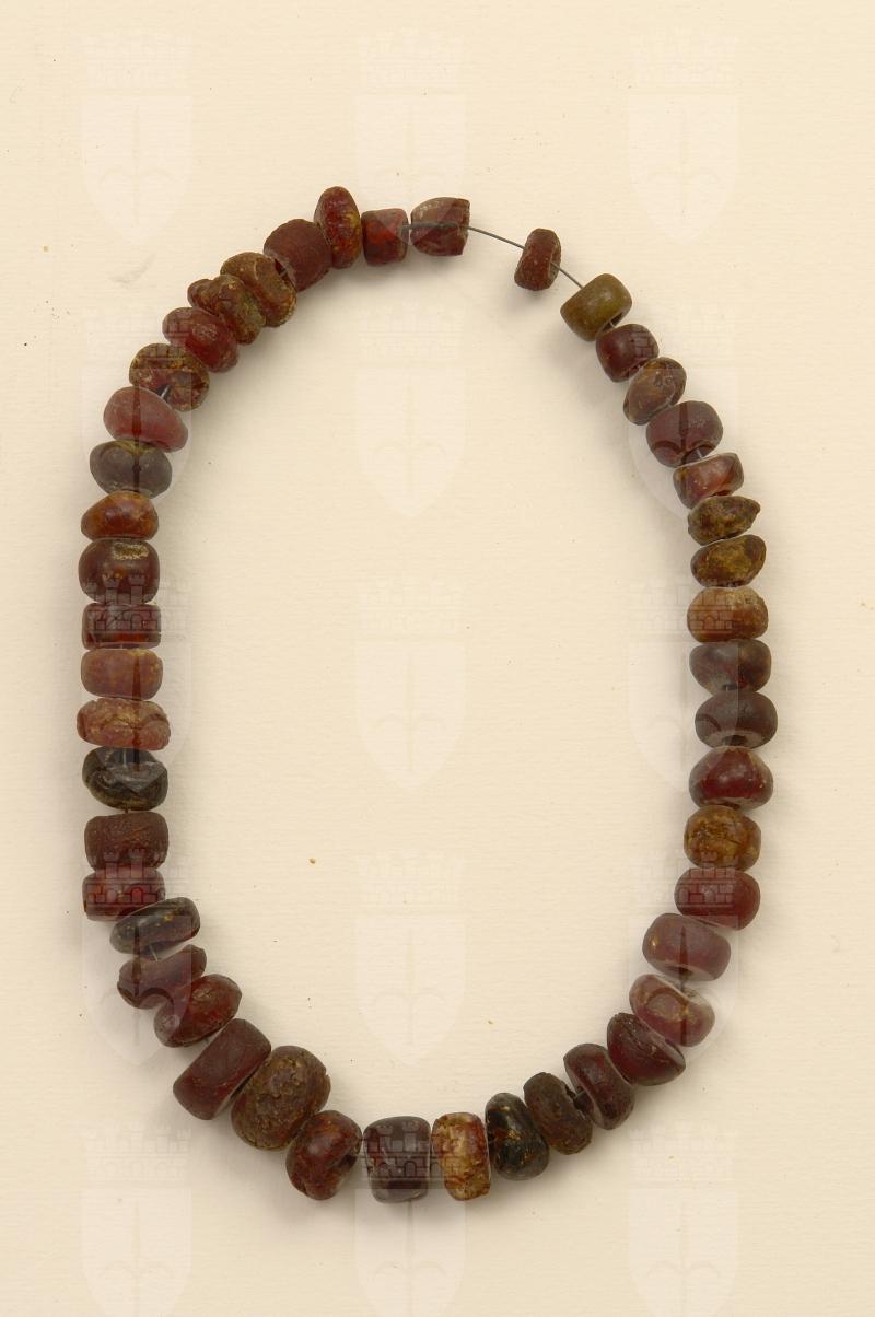 Collana costituita da 46 vaghi d'ambra di dimensioni e forme leggermente diverse (cilindrica, con estremità a profilo arrotondato; discoidale, ispessita). L'ambra ha colore da rosso bruno, semitrasparente, a bruno, semitrasparente. Al centro sono presenti due vaghi di dimensioni maggiori degli altri. Molti esemplari sono di fattura curata, hanno forma regolare e le superfici sono levigate. I fori passanti sono perfettamente circolari e con diametro simile.